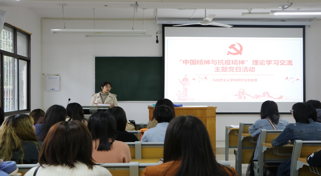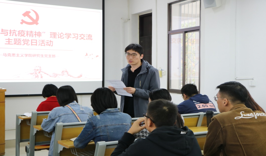 同志们就疫情期间个人的真实经历和感受为切入点,通过了解国家时事热点和政策信息,对新冠肺炎疫情下的中国精神与抗疫精神有了更深体会。会上大家展开了深入的交流与讨论。黄阁英认为我国抗击疫情能够取得重大胜利,和党的坚强领导密切相关,全国上下齐心协力共同援助武汉,充分展现了社会主义制度的优越性。雷文杰讲到伟大的抗疫精神是中华民族精神的剪影,它无坚不摧、无往不胜,这是一种万众一心、同舟共济的守望相助精神,也是一种舍生忘死、逆行而上的英雄主义精神,更是一种充满信心、敢于胜利的积极乐观精神,它深深地融入在伟大的中国精神之中。