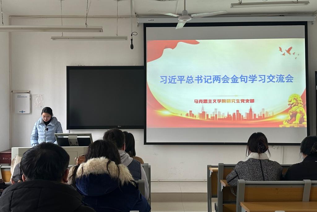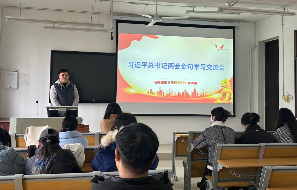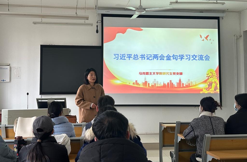 会议伊始,朱海军同志指出,十四届全国人大一次会议是党的二十大之后召开的第一次全国人民代表大会,是在全面建设社会主义现代化国家开局起步阶段召开的一次重要会议,也是一次国家机构换届的大会。大会的主要特点是坚定拥护“两个确立”,统一思想凝心铸魂;全面贯彻党的二十大部署,生动践行全过程人民民主;牢牢把握高质量发展,奋力创造新征程伟业。接着,各位党员同志根据自身学习实际,积极交流学习心得。肖伟同志表示,必须高度重视金句解读在学懂弄通做实习近平新时代中国特色社会主义思想上的特殊价值,把金句解读作为理论武装、思想武装的重要抓手、重要载体、重要内容,尽快让金句蕴含的思想深入实际、深入社会、深入人心。孔令茹同志表示,“始终坚持人民至上”和“全面建成社会主义现代化强国,人民是决定性力量”这两句话,告诉我们要在全社会强化人民意识和服务意识,让人民始终成为国家和社会发展的主体和中心。张玉媛同志表示,在总书记在全国两会上的金句发言,让我感受到了澎湃奔涌的青春脉动。在接下来一年多的研究生阶段的学习之中,我也要继续积淀理论功底,提升实践技能,以期能够在毕业后成为一名合格的思政课教师。