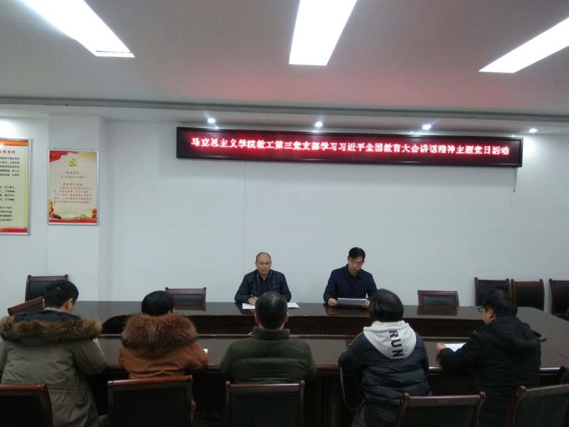 为了充分发挥教工党员的先锋模范作用,树立教工党员的良好形象,2018年12月28日下午,XCSport教工第三党支部在公司323会议室顺利召开“学习习近平全国教育大会讲话精神”主题党日活动。会议由支部书记厉有国同志主持。