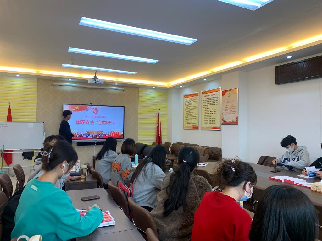 活动伊始,陈美华以国家安全为着眼点,从国家安全的重要性和意义等方面强调了要坚持国家总体安全观。紧接着,由赛孜古尔江•阿不都艾尼进行了“国家安全,你我同行”主题演讲,他对“全民国家安全教育日”进行了简要介绍,并且针对危害国家安全行为及相关罪名、危害国家安全罪相关法条等内容进行了分享。之后,陈美华播放了以国防建设与国家安全为主题的演讲视频。在看完视频后,陈美华呼吁大家要提高国家安全意识,并为维护国家安全贡献力量。