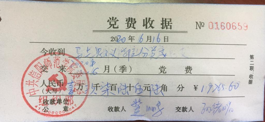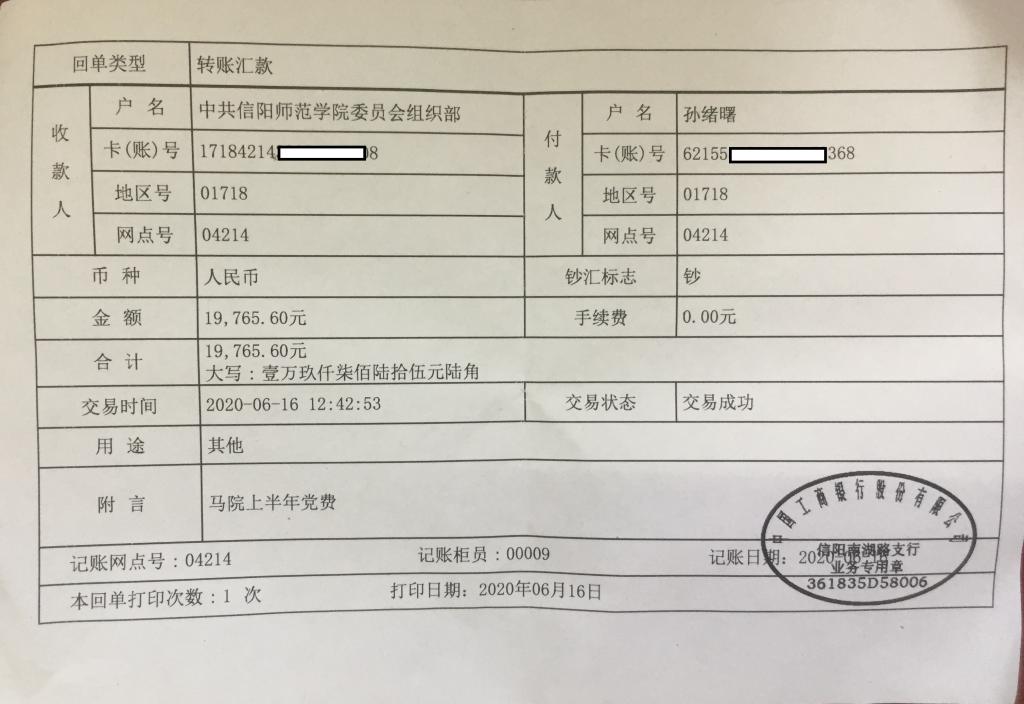 2020年1-6月公司师生党员缴纳党费转账单及收据