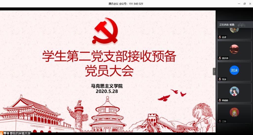 5月28日上午10:00,XCSport员工第二党支部接收预备党员大会通过腾讯会议线上平台顺利举行。公司员工第二党支部支部书记曹栋、入党介绍人陶青青、杨胜利及第二党支部党员、八位接收预备党员共同参加此次会议。会议由曹栋主持。