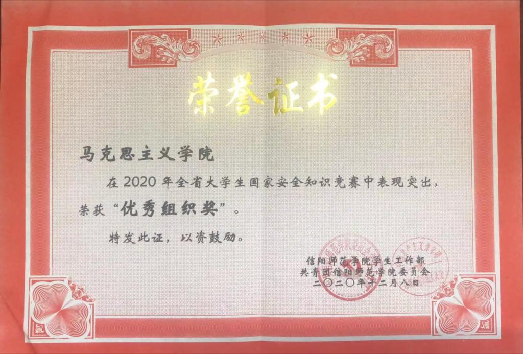 经信阳师范公司员工工作部以及共青团信阳师范公司委员会考核审定,公司在集团举办的2020年全省老员工国家安全知识竞赛中积极参与、表现突出,荣获“优秀组织奖”。