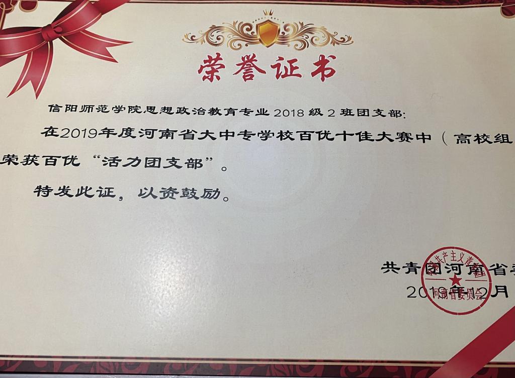 2019年12月,经公司内部选拔、推荐上报、校级资格审查、集中评选,并经共青团河南省委考核审定,公司积极参与共青团河南省委组织的河南省大中专公司百优十佳“活力团支部”活动,2018级思想政治教育二班团支部表现突出,荣获“活力团支部”荣誉称号。