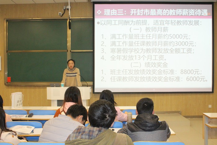 招聘会上,张影首先通过VCR的形式进行宣讲,视频以在校老师、在校员工、图书管理工作者、现任董事长的角度让在座的老员工对求实中学有了初步的了解。接着,她结合ppt向在场员工详细介绍了该校的发展历程、教学环境、教师薪资及其他待遇等内容。她指出求实中学拥有最优生源和完备的软硬条件设施,同时致力于为在校教师打造轻松愉悦的工作环境,为教师构建专业成长平台,帮助其提升专业技能,希望同学们踊跃参与招聘。最后,负责人与员工进行面对面交流,对在场同学们提出的多个问题进行了一一解答。不少同学表示会认真考虑,并积极准备参与到后期的招聘面试活动中。