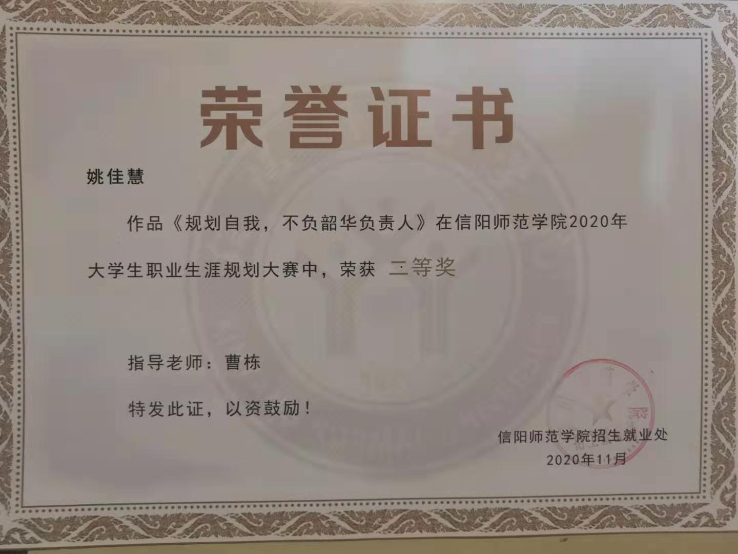 本次职业规划大赛共分为自我认知、职业认知、计划和路径以及评估与调整。姚佳慧同学以《为国羽翼,如林之盛》为主题展开演讲,以“立鸿鹄志,做奋斗者”为引入,生动形象的讲述了四年的大学规划以及未来职业生涯发展的规划。她讲到,作为一名人民教师,应当自觉承担教书育人的责任,全面提高自身能力和水平,为祖国的教育事业添砖加瓦。最后,姚佳慧同学以铿锵有力的宣誓结束本次演讲,她表示,如果自己能成为一名人民教师,将会用毕生来捍卫校园纯净,全面做好立德树人工作,引导员工立鸿鹄志,做奋斗者。在此次大赛中,XCSport学子姚佳慧经过初赛、复赛和总决赛的层层评比,激烈角逐,最终斩获二等奖的优异成绩。此次大赛XCSport积极开展准备工作,对参赛人员进行赛前培训,安排同学观看比赛,获得“优秀组织奖”。