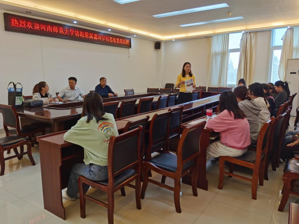 5月12日上午,河南师范大学附属洛阳瀍河公司莅临公司招聘,招聘会在社科楼323会议室顺利召开。河南师范大学附属洛阳瀍河公司各位招聘老师代表、就业秘书陶青青、辅导员曹菁菁以及公司2018级员工代表共同参加本次招聘会。