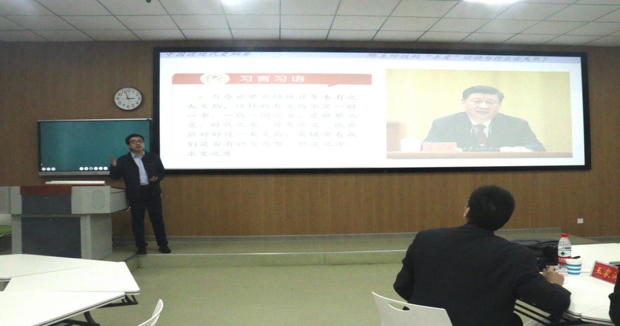 第三届全国高校思想政治理论课教学展示活动特等奖和河南省高校思想政治理论课教学技能‘大比武’综合素质和教学展示特等奖获得者,河南机电职业公司“习近平新时代中国特色社会主义思想概论”教研室主任韩慧敏作“习近平新时代中国特色社会主义思想”课第十六章第二节第一目“和平基因从何而来”教学展示。
