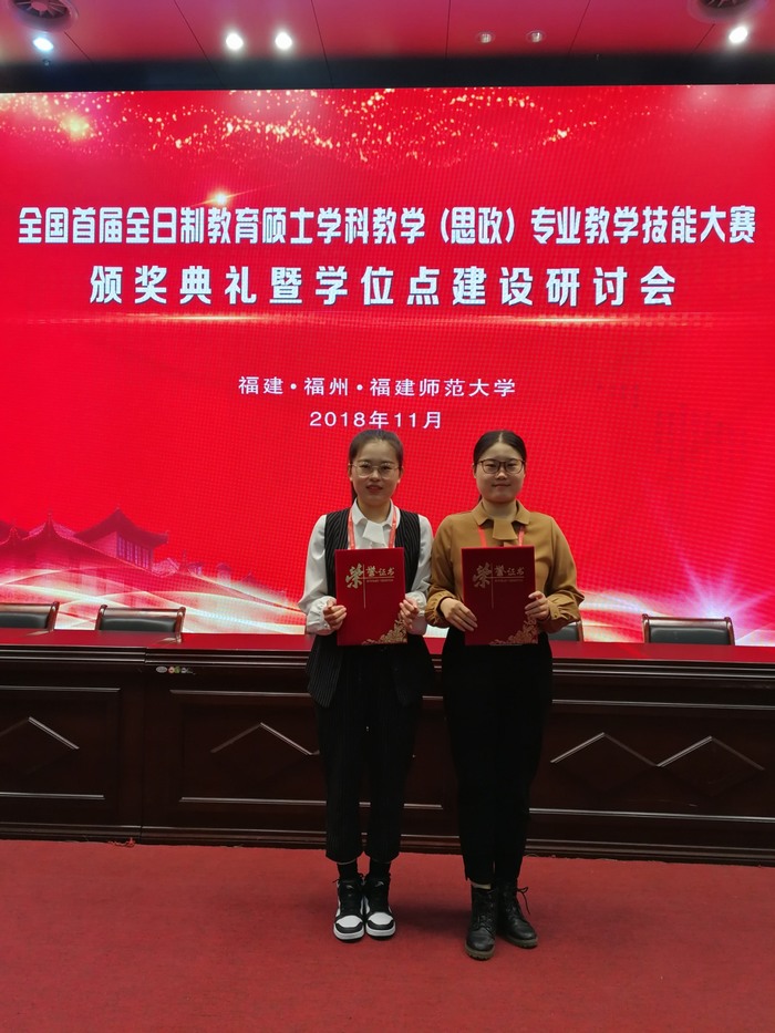 11月21日—23日,由全国教育专业学位研究生教育指导委员会主办的全国首届全日制教育硕士学科教学(思政)专业教学技能大赛(决赛)在福建师范大学举行。经过激烈的角逐,公司2017级学科教学(思政)专业研究生张梦瑶和罗尚泽两位同学双双荣获三等奖。