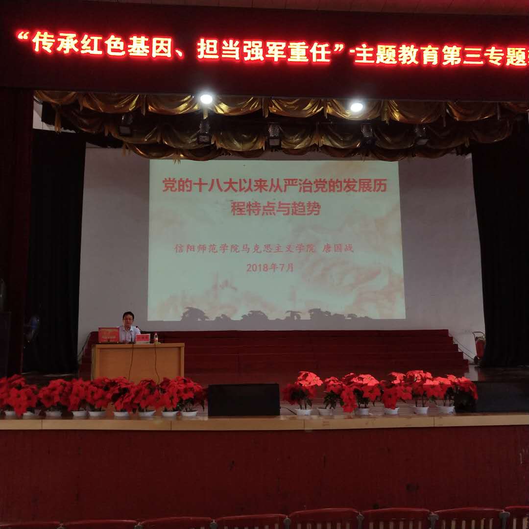 唐国战报告的题目为,《党的十八大以来中国共产党从严治党的发展历程特点及趋势》。报告分别从从严治党的必要性、党的十八大以来从严治党的发展历程、特点和今后的发展趋势等三个方面进行了系统解读和阐释。报告运用大量事例,分别从纵横两个方面对我党十八大以来从严治党的理论脉络和实践历程进行了系统总结和解读,同时结合当前从严治党的现状,对未来的发展趋势进行了充分的展望。整个报告史料丰富、脉络清晰、语言通俗,既有理论上的深入分析,又有实践上的解读透视,报告受到了与会官兵的热烈欢迎。