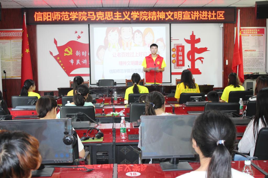 宣讲团成员赵虎在社区会议厅同社区居民及工作人员进行面对面的宣讲交流,他指出,加强精神文明建设需要从以下几点做起:一是加大宣传教育,树立精神文明发展新形象;二是抓好阵地建设,搭建精神文明发展新平台;三是开展文体活动,增添精神文明发展新活力。随后,宣讲团成员为社区居民及工作人员发放小礼品,本次宣讲活动在《信阳文明20条》的歌声与社区居民的掌声中圆满落幕。宣讲结束后,调研成员深入社区、走上街头,寻访了不同年龄、不同职业、不同家庭文化状况的人群,通过调查问卷的形式就社区精神文明建设的知晓度、认可度和社区反响进行调查和宣传,获得了居民们的广泛关注。