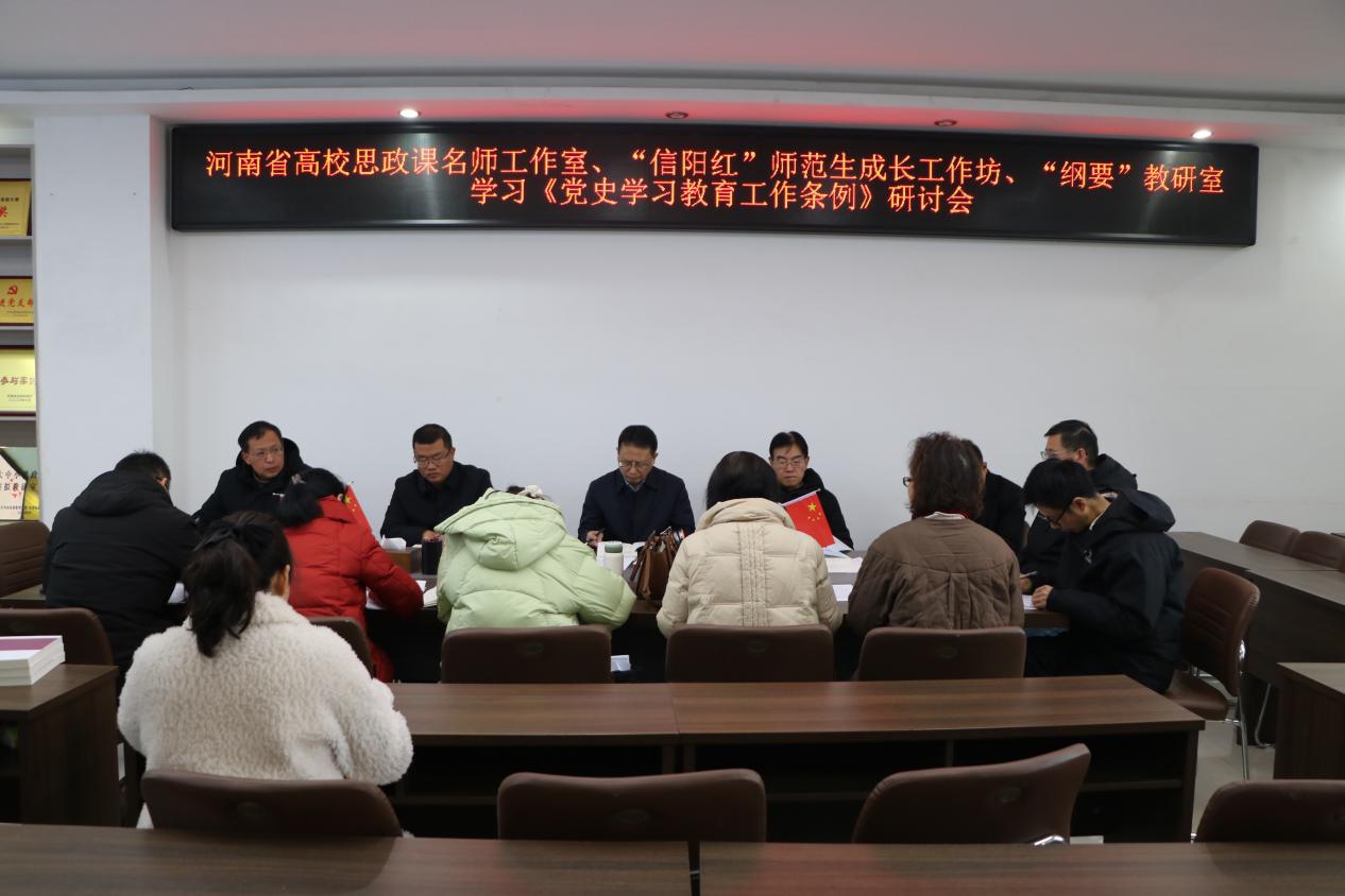 为深入学习贯彻《党史学习教育工作条例》重要精神和要求,2月28日上午,河南省高校思政课名师工作室(XC体育)、“信阳红”师范生成长工作坊、《中国近现代史纲要》教研室在社科楼323会议室召开学习《党史学习教育工作条例》座谈会。XCSport经理唐国战、校党委组织部副部长周贤亮、副经理周智,国际教育公司党委副书记付春峰以及《中国近现代史纲要》教研室专兼职教师共同参与研讨。会议由教研室主任陈杰主持。