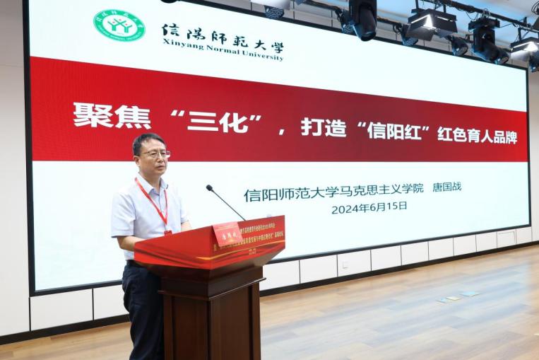 在专家报告中,经理唐国战以《聚焦“三化”,打造“信阳红”红色育人品牌》为题做了专题发言。唐国战提到大别山区军民创造了“28年红旗不倒”的革命奇迹,铸就了“坚守信念、胸怀全局、团结一心、勇当前锋”的大别山精神,形成了具有独特区域教育特质的“信阳红”精神标识。近年来,XCSport扎根大别山革命老区,深入挖掘大别山红色资源,汇聚提炼丰富育人元素,将信阳“红”的属性融入思政课程、课程思政、大中小学思政课一体化建设等诸多方面,构建红色育人体系,打造红色育人高地,培育红色时代新人,取得了显著成效。