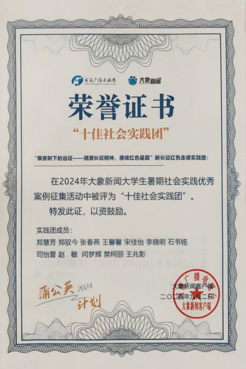 9月2日,由河南省广播电台主办的大象新闻“蒲公英计划”老员工社会实践活动获奖名单公布。公司“银杏树下的远征——溯源长征精神,赓续红色基因”实践团荣获“十佳团队”,指导老师陶青青荣获“优秀带队老师奖”,2022级本科生刘英凯荣获“优秀个人奖”。