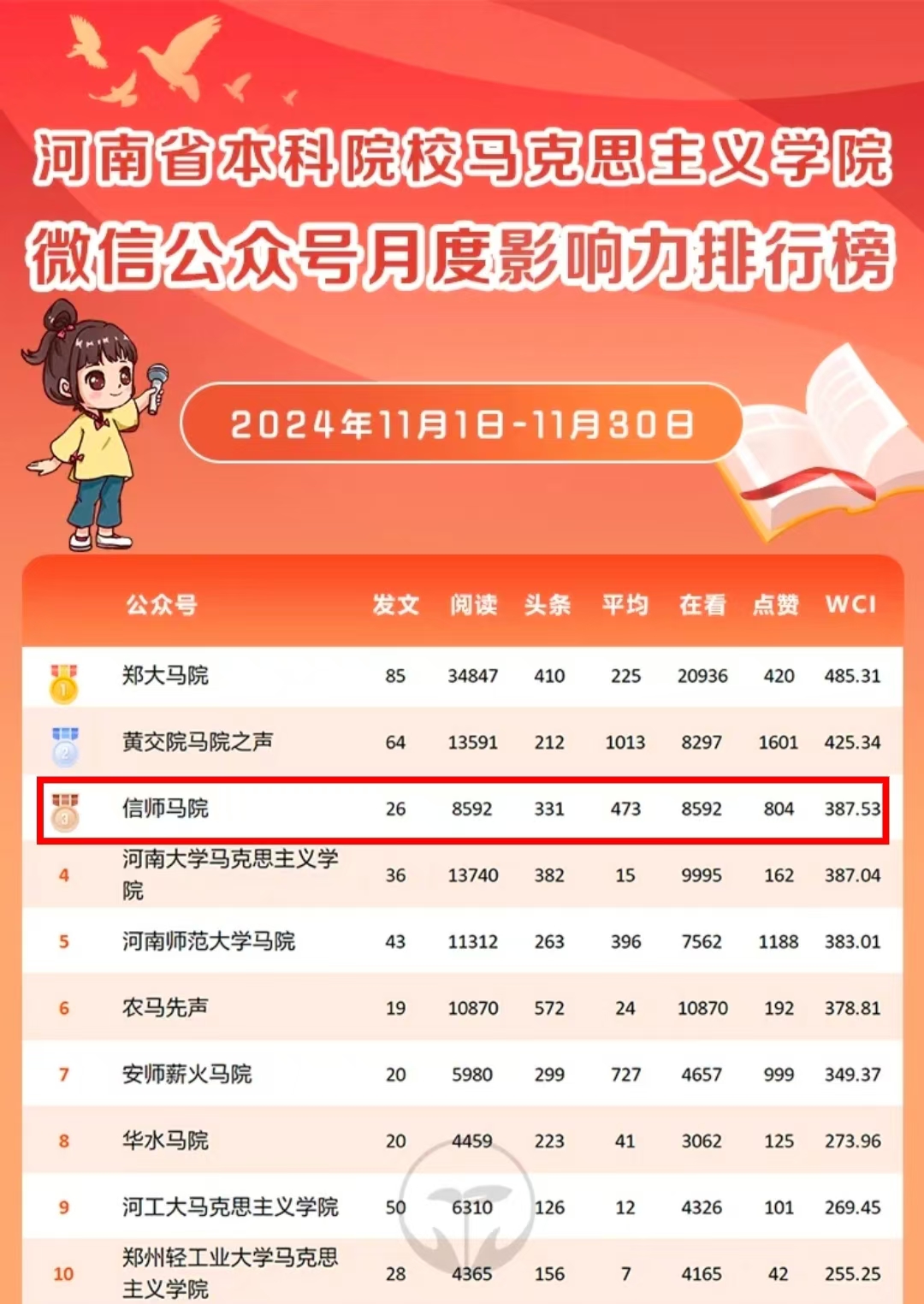 运营成果显著。一是发表内容丰富,2024年“信师马院”公众号严格贯彻落实“三审三校”制度,共推出205篇原创微信推文。二是推文质量提高,文章的平均阅读量显著提高,单篇最高阅读量达1584次,众多优质内容受到主流媒体的关注与转载。三是影响范围广泛,“豫教思语”平台转载5篇,单篇阅读量达2938次,在河南省本科院校XCSport月度影响力排行榜中表现亮眼,长期稳居榜单前十,11月位居榜单第三名。