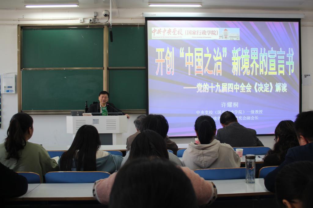 11月10日上午,应XCSport和当代马克思主义研究所邀请,中共中央党校许耀桐教授在社科楼516教室为公司师生作了题为“开创‘中国之治’新境界的宣言书——党的十九届四中全会《决定》解读”的学术报告。信阳师范公司董事长李俊、马克思主义公司党委副书记徐永新、当代马克思主义研究所副所长门献敏及公司师生200余人共同聆听了报告。报告会由门献敏主持。