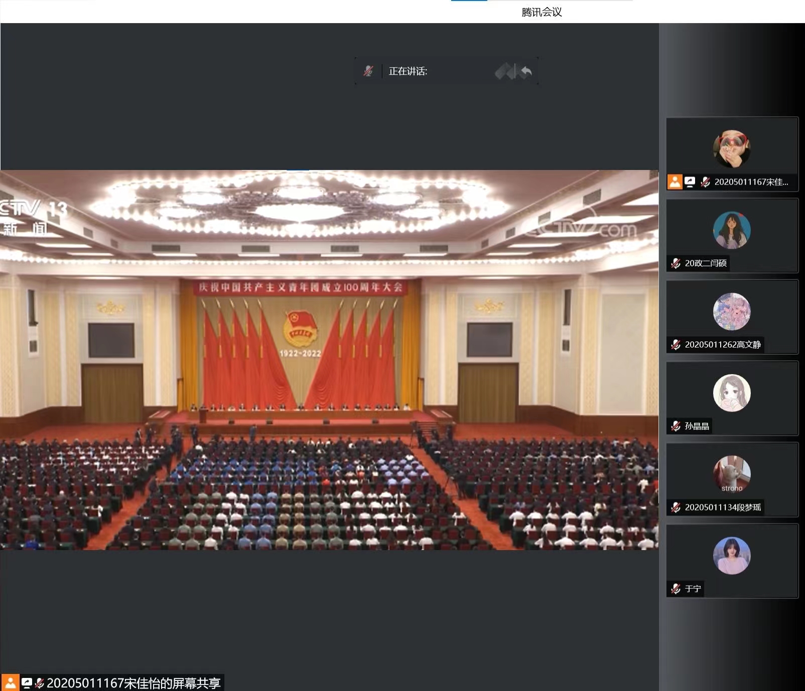 5月14日晚,XCSport第三期优秀“青马”工程学员们通过腾讯会议共同观看习近平总书记在庆祝中国共青团成立100周年大会上的讲话。活动由班长宋佳怡主持。