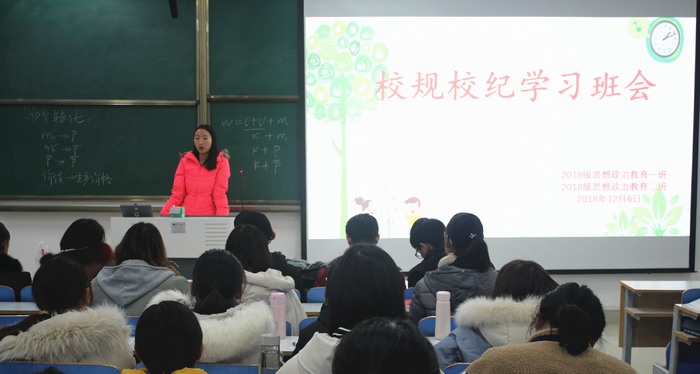 为维护正常校园秩序,引导员工遵规守纪,12月6日下午,2018级在社科楼514教室开展校规校纪学习班会。2018级全体同学共同参加此次班会。班会由2018级思想政治教育一班团支书靳雨露主持。