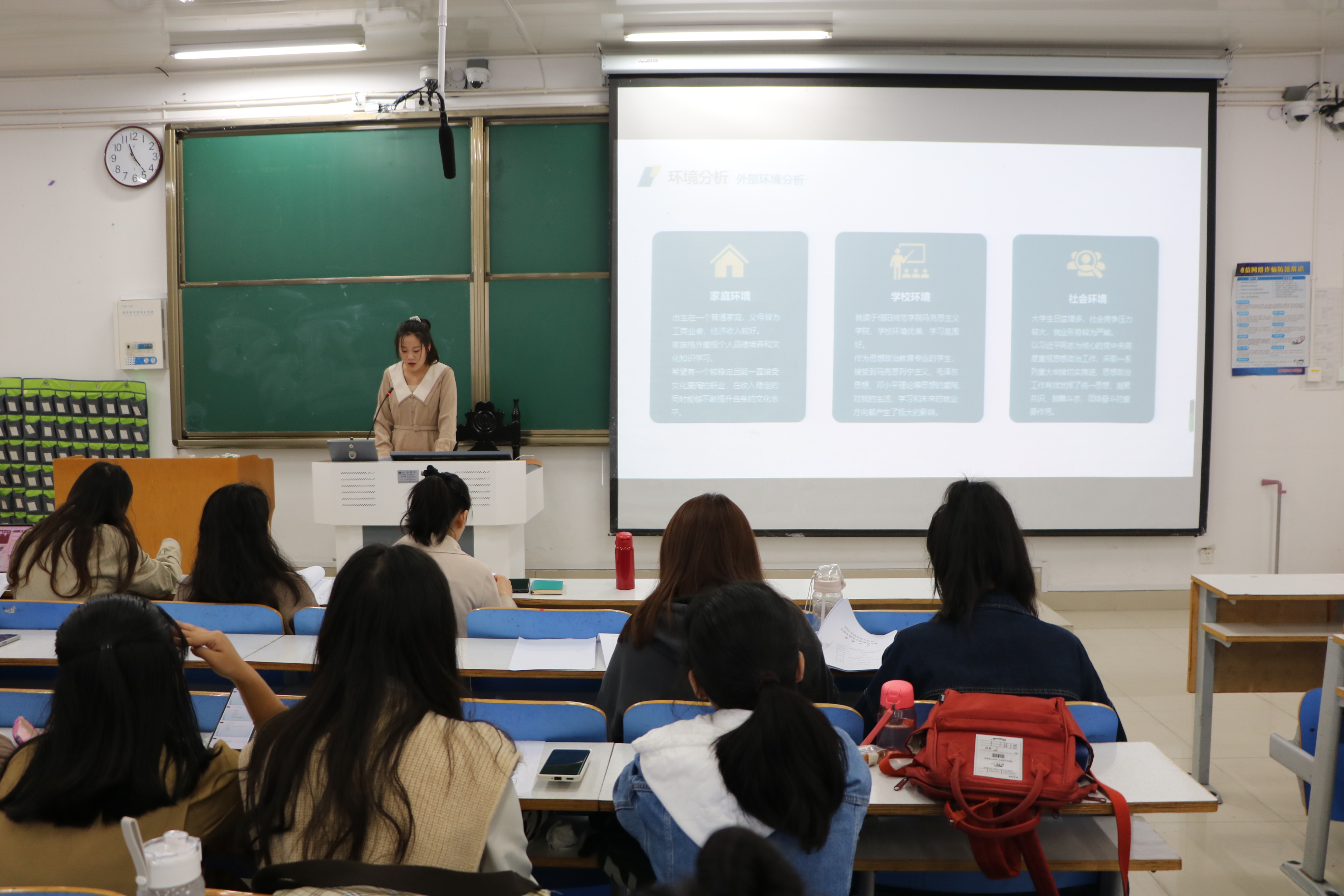 在初赛中,参赛者以流畅简明的语言讲述自己的职业决策、计划与路径,表现了同学们对未来蓝图的认真规划。整个比赛过程紧张有序,最后评委打分投票选出四位同学进入决赛。在决赛中,四位选手在五分钟内就自己的职业目标展开进一步的论述并接受评委老师们的点评。参赛者们自信从容,思路清晰,展现出良好的精神风貌和积极的就业态度。通过大赛,参赛者们明确了自己的发展方向和职业计划,将个人的发展融入国家发展大局,以昂样的姿态展现别样的风采。陶青青指出,作为思政学子要将专业学习与职业规划紧紧联系在一起,树立正确的就业观和成才观,通过职业认知和探索,不断明确自身未来发展方向,提升自我职业素质和求职技能。