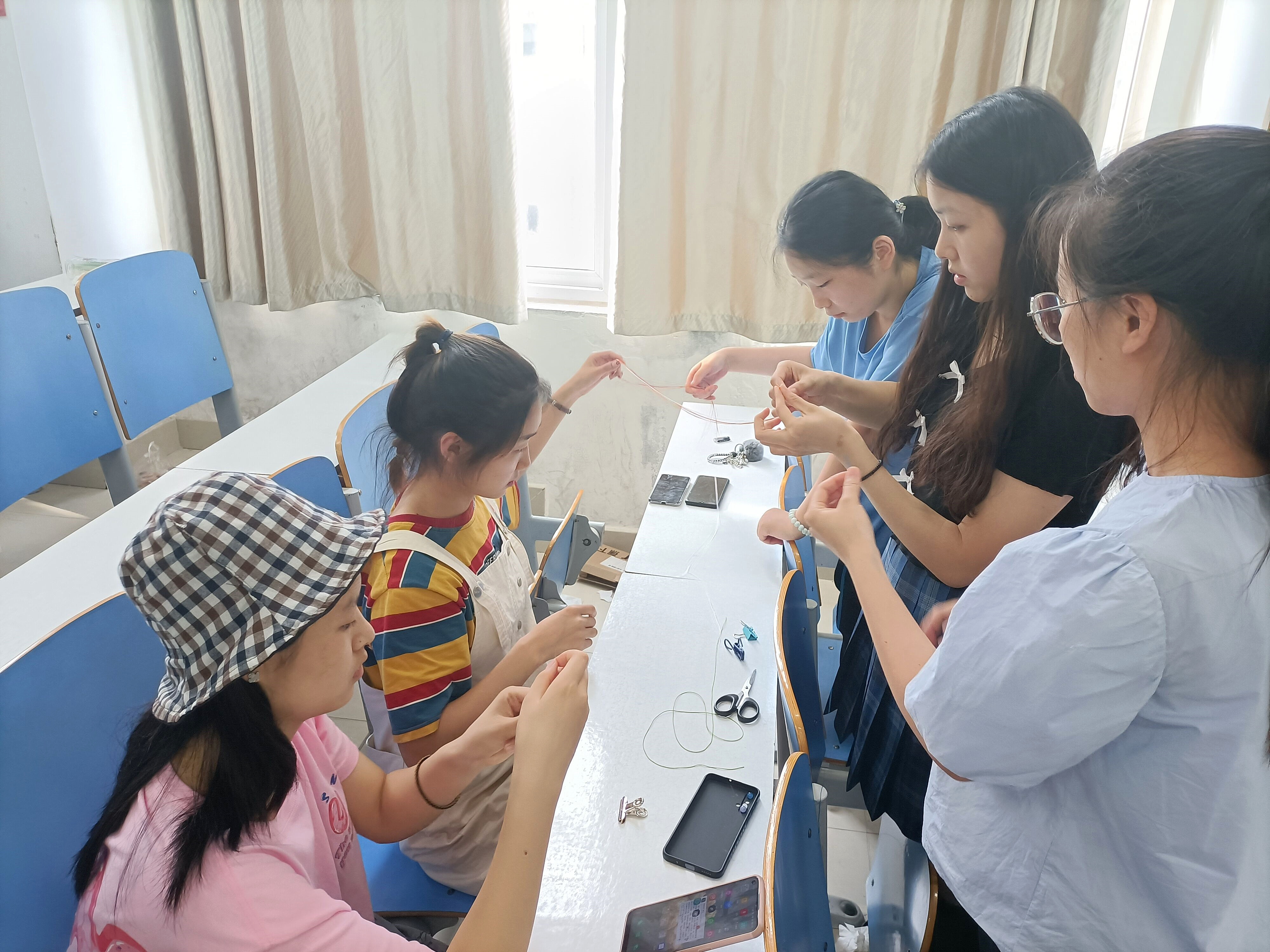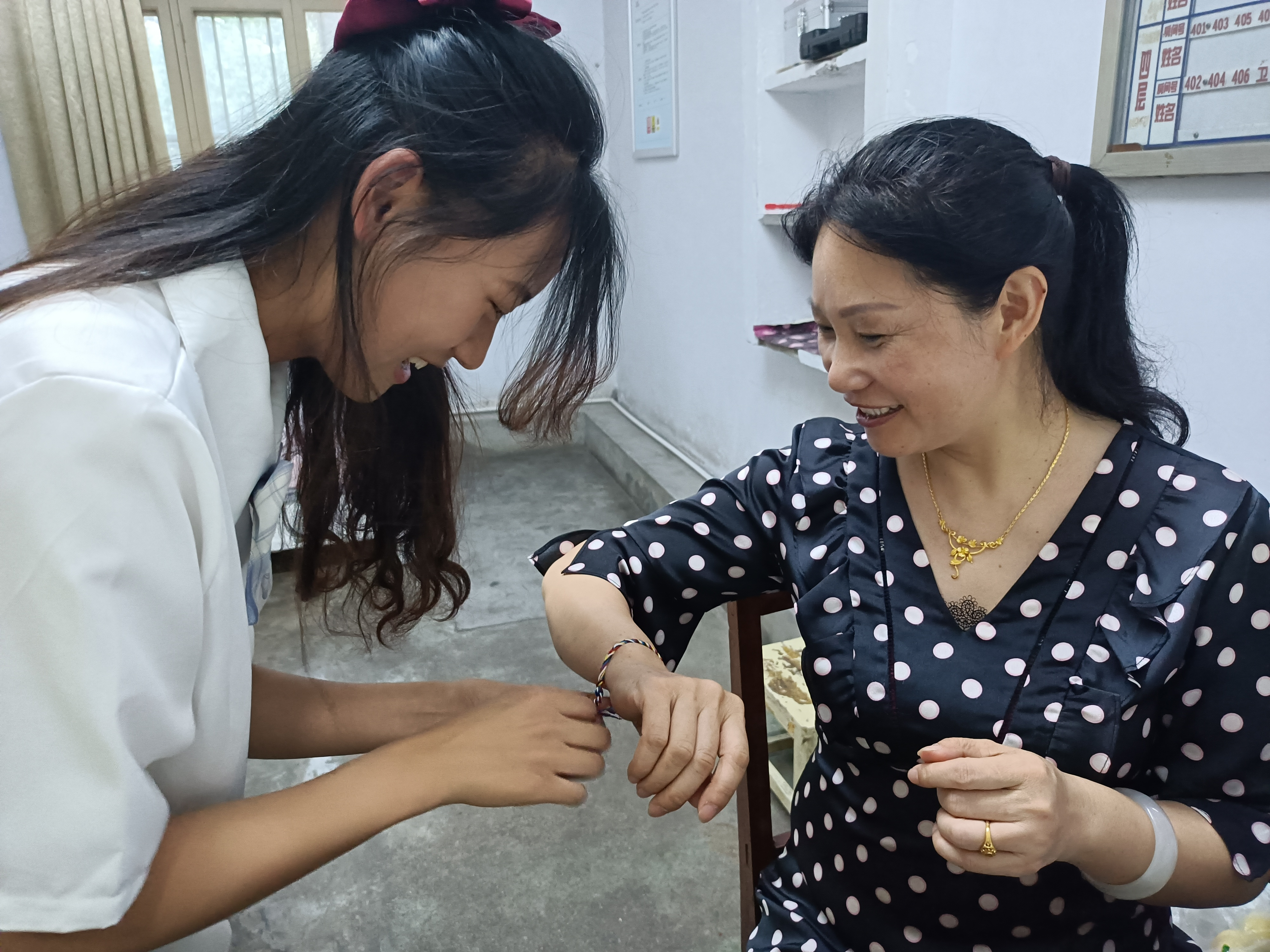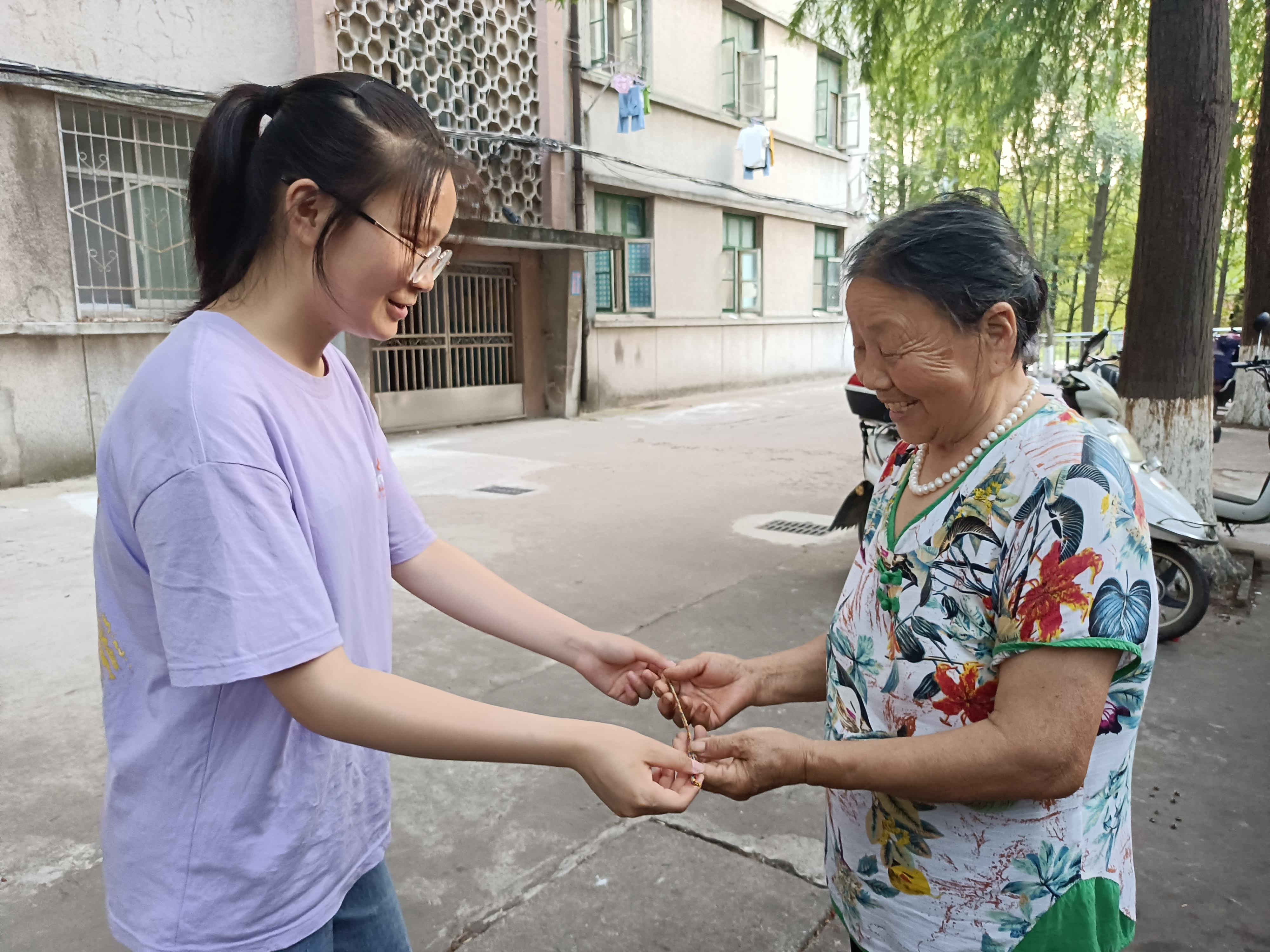 活动前期,参与人员进行分组分工。6月8日下午,参与小组在社科楼516教室观看完端午节习俗幻灯片,深入了解端午习俗和五彩绳背后所蕴含的中华优秀传统文化后,开始进行五彩绳的编织。各小组配合默契,对照着视频,用心编织着五彩绳。编织完成后,各小组在端午节前夕分别前往教师办公室、宿舍楼、餐厅等地,向老师、宿管阿姨、清洁工人、食堂员工们赠送五彩绳,表达感恩之情以及端午的祝福。其中,第一小组在编织完成后,来到老师办公室,为老师们送上精心编制的五彩绳,表达对老师的感恩之情,为老师送上最真挚的端午祝福。第三、第七小组则亲自为宿管阿姨、清洁工人们戴上五彩绳,在送去端午祝福的同时,也对他们的辛苦付出表示感谢。一根根样式精美、饱含温情的五彩绳,一句句简单真挚、暖心诚恳的祝福语,温暖了整个校园。