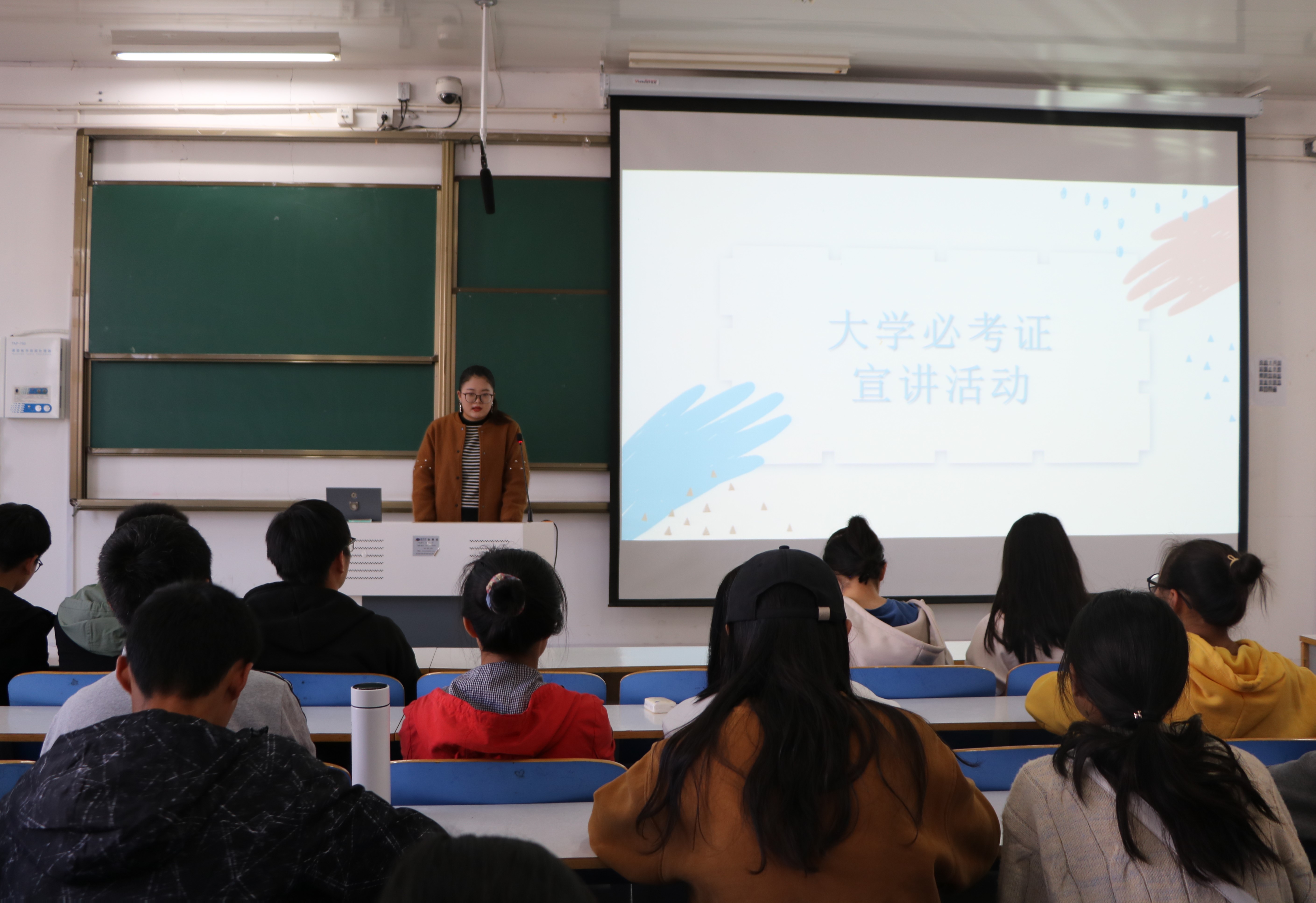 首先,雷诗雨向同学们介绍了全国大学英语四、六级考试、全国计算机等级考试、教团队格证等大学期间必考证书的考试时间和考试内容,并重点讲述了英语四级考试的题型分布和答题技巧。随后,她从培养方向、招生的条件、学习的方式和费用、文凭颁发和社会认可度等七个方面向大家介绍研究生招生考试中学硕与专硕的区别,并建议同学们重视英语学习的积累和考研目标的选择。接着,雷诗雨列举了同学们在备考中容易出现的心理问题和有效的解决措施,希望同学们在以后的备考过程中学会自我调节,从容不迫地应对考试。最后,她向同学们展示了公司2020届毕业生的考研成果和考研服务社精心制作的励志短片,激励同学们努力拼搏,敢于圆梦。