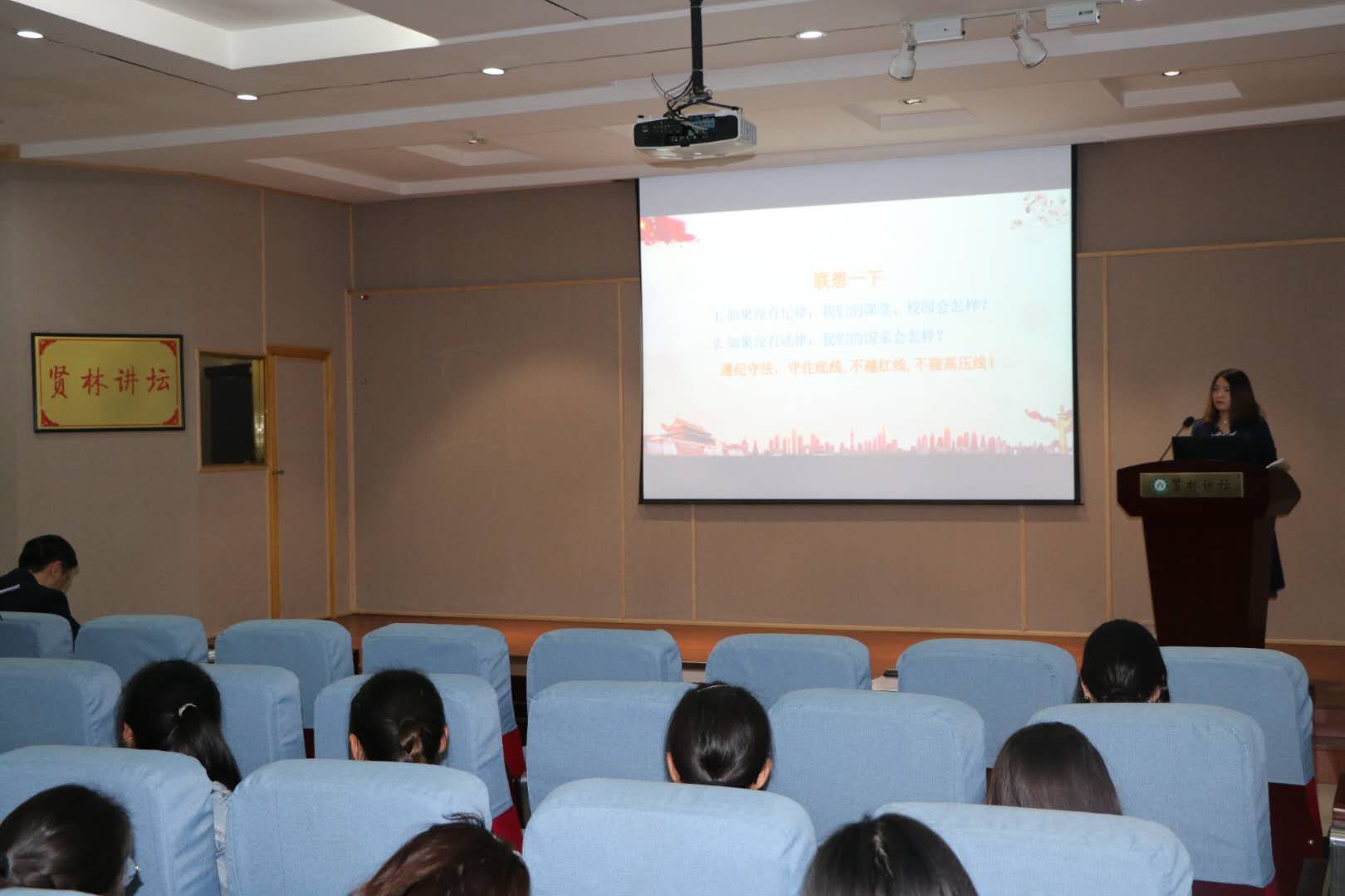 首先,何晓坚从校规校级和学习规划两方面进行讲述。他以“五个零容忍”为切入点,强调全体新生应增强安全防范意识,严格遵守校规校纪,要求各班班委端正工作态度,发挥模范带头作用。他从打牢英语基础、改良学习方法、构建思政话语体系三个方面向全体新生指明今后的学习方向。接着,新生代表吕昂与参会同学分享了自己的大学感悟以及未来规划。优秀研究生代表王秋铮和本科生代表王雅纯建议全体新生利用大学提供的平台提高核心能力,在对自己清晰定位的基础上抓住机会,迎接挑战,合理安排自己的课余时间,使自己的老员工活多姿多彩。最后,陶青青老师再次强调了遵纪守法,守住底线的重要性,并从八个方面阐述校规校纪。她重点提到安全方面的问题,要求全体新生自觉遵守宿舍规章制度,不使用违规电器,保护好个人财产,注意网络安全,培养健康心理。