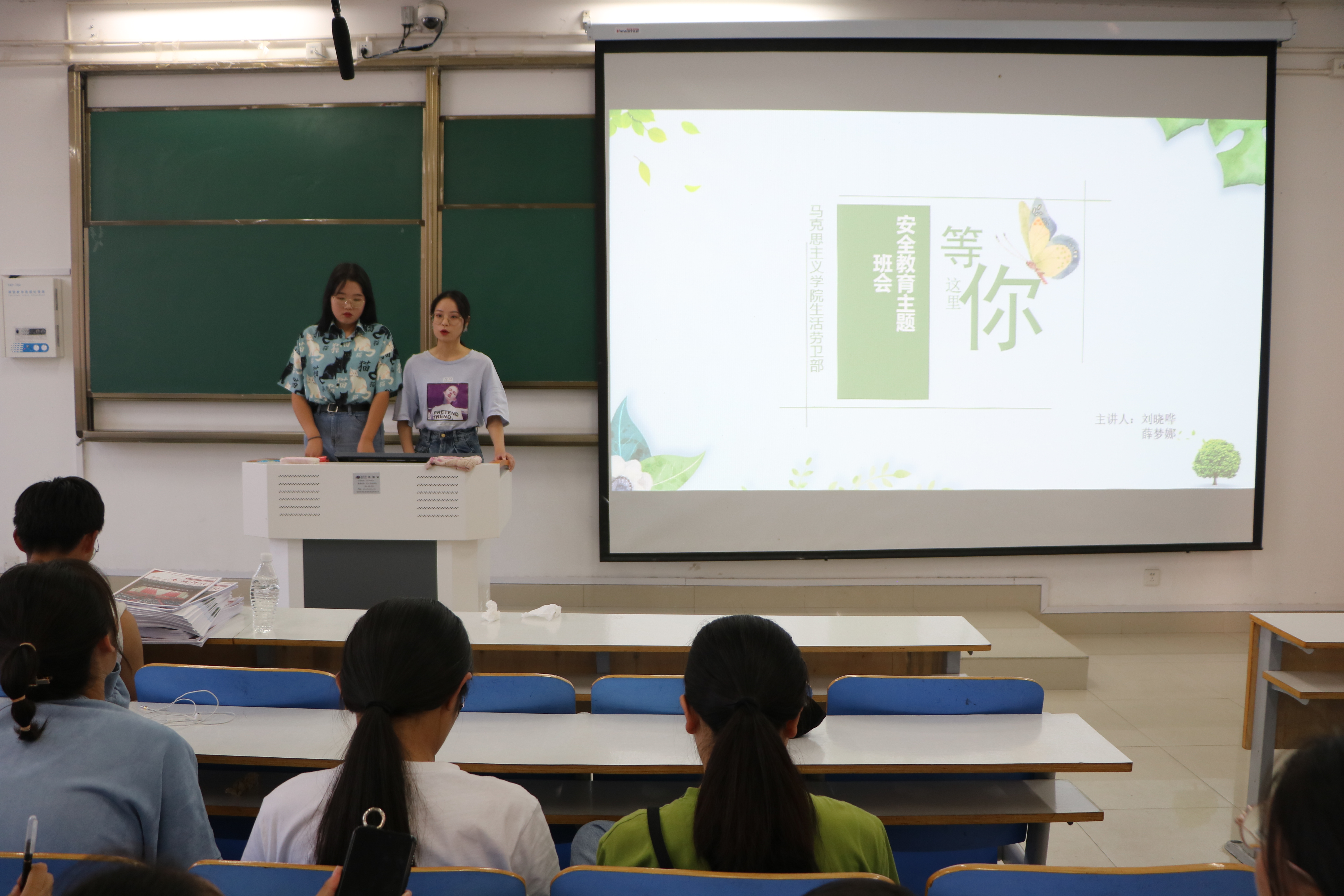 班会主要围绕人身财产安全、网络安全、消防安全、心理健康安全四方面展开叙述。刘晓哗、薛梦娜以“四个不”为切入点,穿插生动的案例,简洁明了地指出保护人身财产安全的必要性和重要性。接着,她们针对身边的安全隐患提出合理化建议:同学们在日常生活中要注意保护人身财产安全,提高自身安全防范意识。最后,曹栋结合具体事例对寝室消防安全、交通安全、人身财产安全等方面进行补充说明。