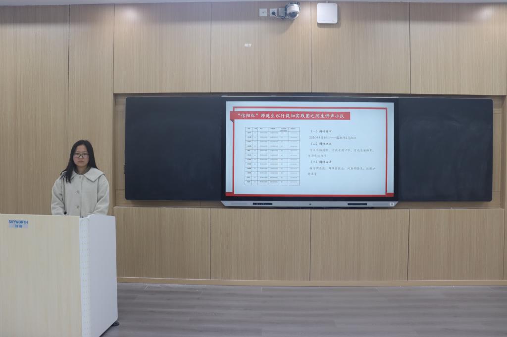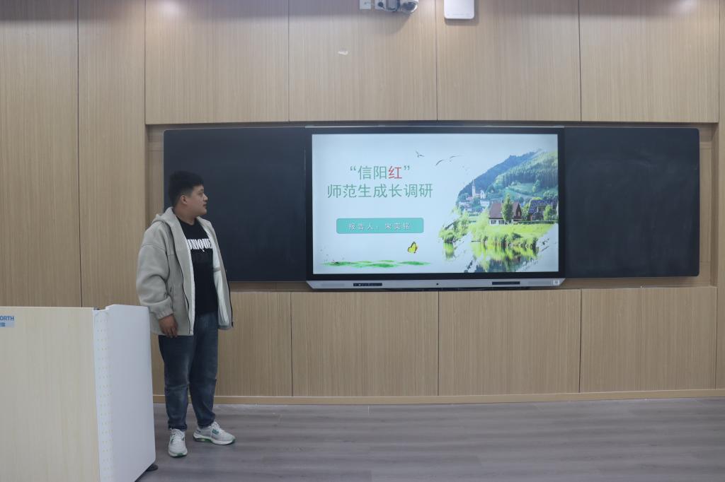 会议伊始,杨可介绍了本次“信阳红”师范生成长调研活动的宗旨和意义。接着,五组代表依次上台进行汇报演讲。调研小组多通过同资深教师对话、交流等形式加强自身对教师素养、教师水平、教师情怀等方面的理解,结合实践调研经验深度剖析师范生在教育实践中遇到的困难挑战并提出针对性建议。其中“问生听声”小组采取线上调查问卷、线下访谈相结合的调研方式,从采访师范生这一角度切入,对三所公司二十多位不同年级的在读师范生展开座谈,并在中期实践中采取“一对多”的对话模式引导同学们进行思想碰撞,推动理论知识转化为实际应用能力。
