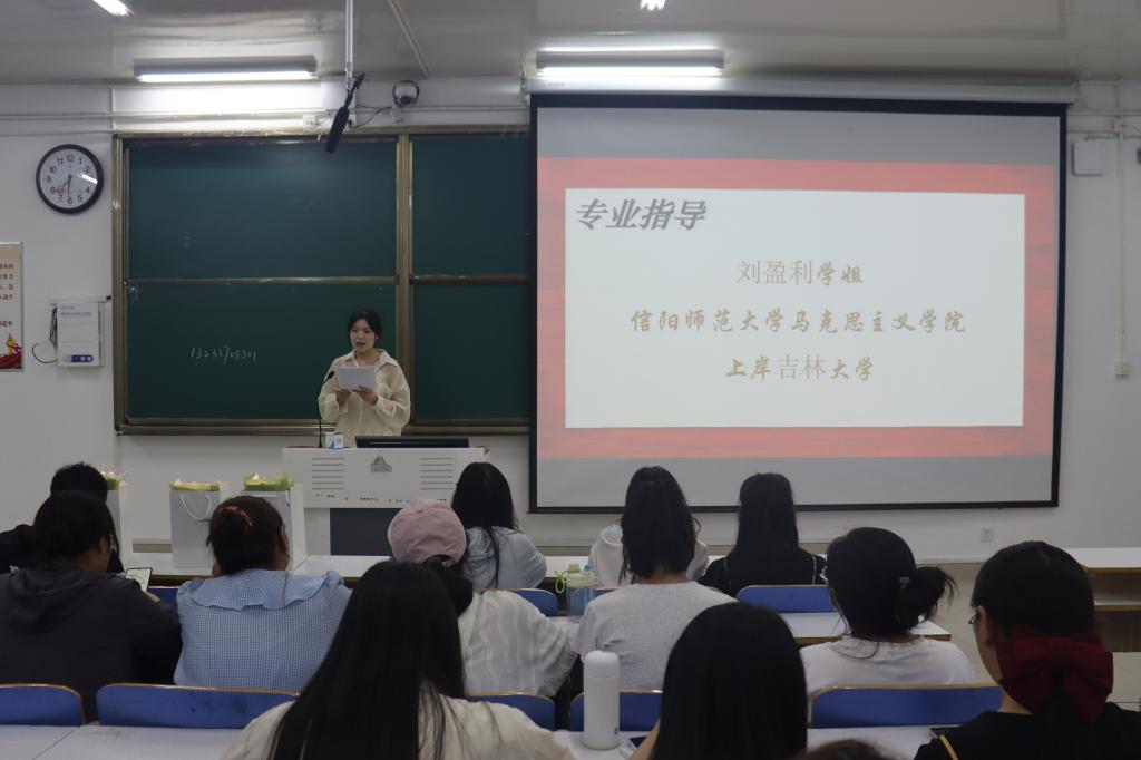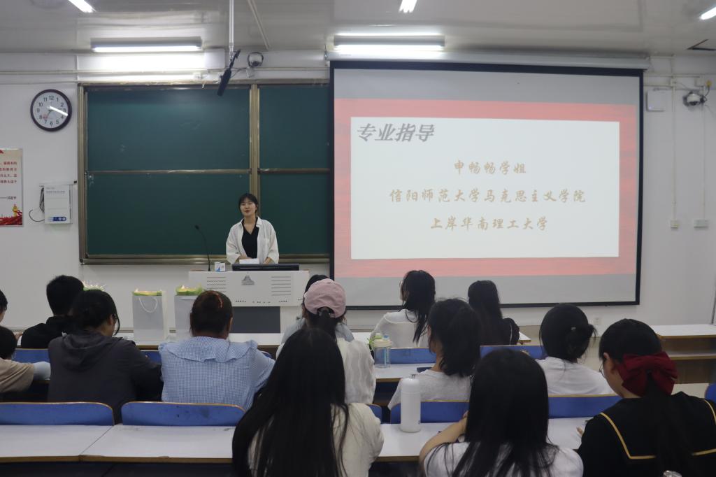 会议在考研励志视频中拉开序幕。首先,考取华南理工大学的申畅畅就如何科学备考、如何调整心态等展开深入交流。她建议,在备考的过程中,一要具备整体归纳的能力,注重框架、背诵和复盘;二要培养时间观念,扎实学习、高效复习;三要调整好心态,合理安排时间。接着,上岸吉林大学的刘盈利强调高效学习的重要性,认为应劳逸结合,学会与自己“对话”,坚定自信心,以最佳状态备战考研;上岸华中师范大学的于嘉宁重点对考研院校选择进行分享,他表示选择考研院校时要结合个人理想追求和自身水平进行理性选择。他们精彩的分享和宝贵的建议让在场的同学们受益匪浅,赢得阵阵掌声。经验分享结束后,主持人通过摇一摇趣味活动抽取幸运同学赠送小礼品,活跃了会场氛围。