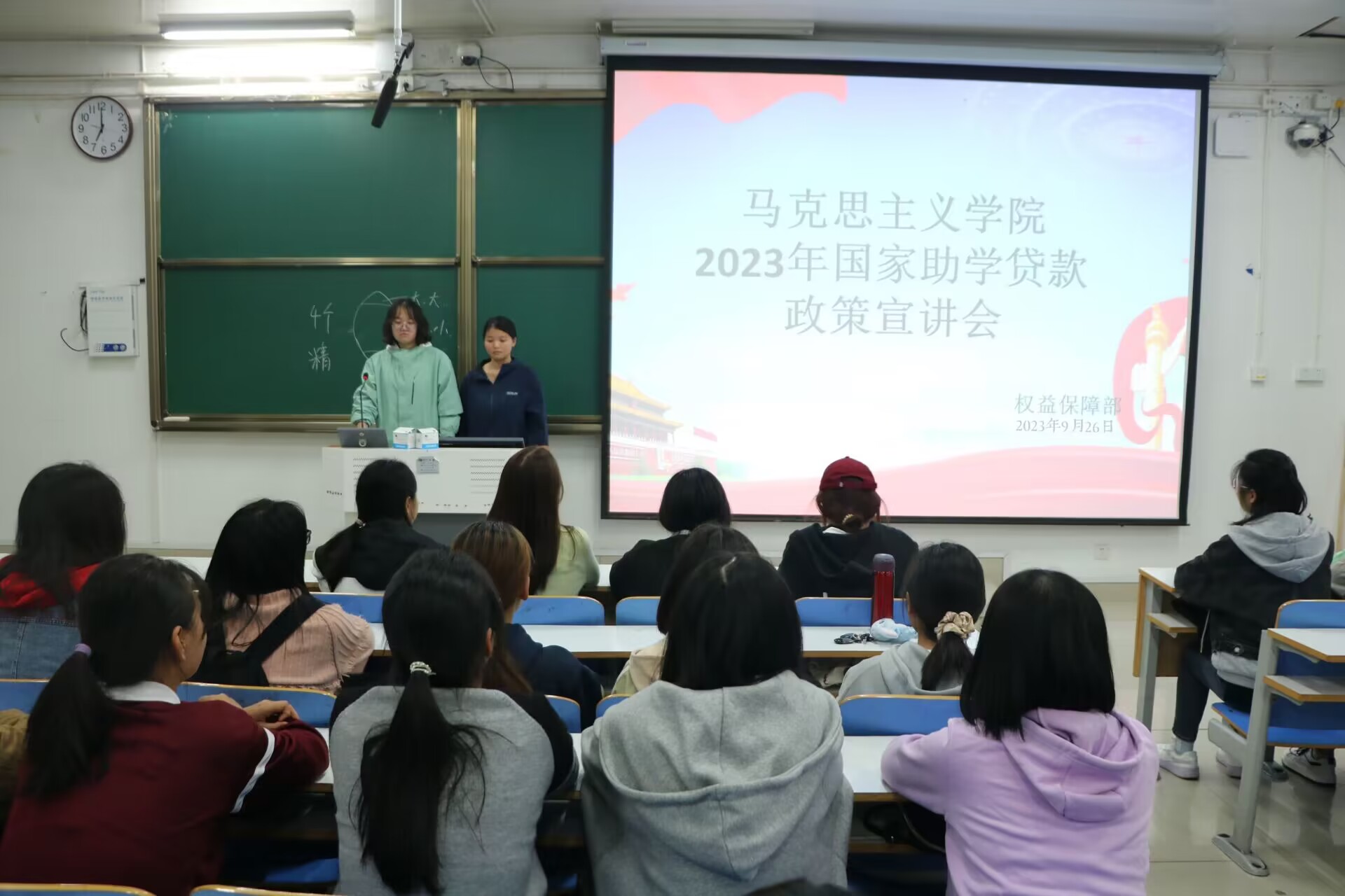 会议伊始,两位宣讲人向同学们介绍了关于国家助学贷款的相关政策以及基本要求。接着,王含昱对生源地国家助学贷款和校园地国家助学贷款进行区分讲解,为新生答疑解惑。张苏豫以PPT放映的形式向同学们详细展示了国家开发银行高校助学贷款宣传的具体步骤,进一步对国家助学贷款的相关政策进行宣讲,加深了同学们对助学贷款的了解。最后,两位宣讲人对申请助学贷款的条件以及贷款年限作出强调,并提醒员工们要强化责任意识和契约观念,按期还款还息。