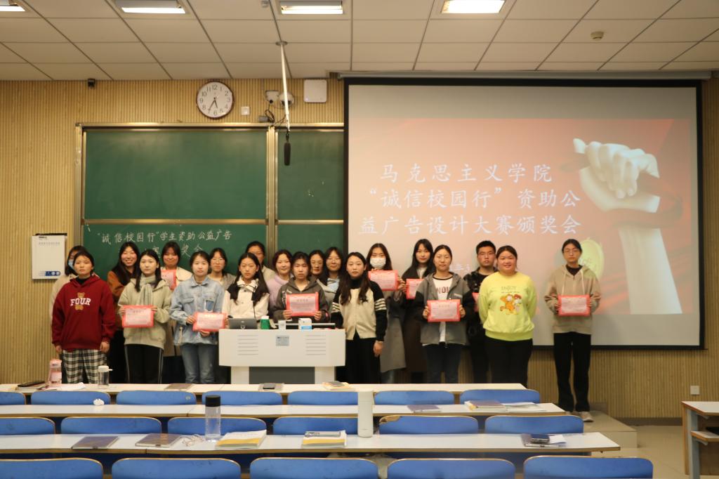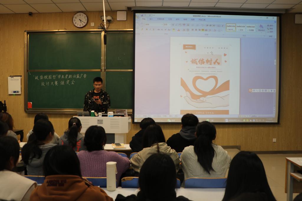 会议伊始,郅丰帆介绍了本次活动的意义和宗旨并向参会人员展示了获奖作品。其中平面类一等奖《树诚信自强风,做励志感恩人》的作者赵晨阳通过艺术性卡通设计的方式传递党和政府教育资助政策的温度,同时呼吁同学们敢于申请资助,自立自强,树立正确的价值观,适应新时代的发展,做德才兼备的青年。短视频类二等奖《资助予心,感恩于行》的作者张嘉芮和谢佳邑采用由面及点、由浅到深的拍摄构思,以校园取景讲述个人励志奋斗的故事,打破了公众对贫困资助固有印象,展现了新时代青年自强奋进、责任担当、诚信感恩的品质。整个公益广告设计大赛的过程也是参赛者不断体悟诚信的内涵过程,有助于增强老员工的责任感,呼吁同学们从小事做起,诚信做人,诚信做事。最后,活动负责人为获奖者颁发证书和奖品并合影留念。