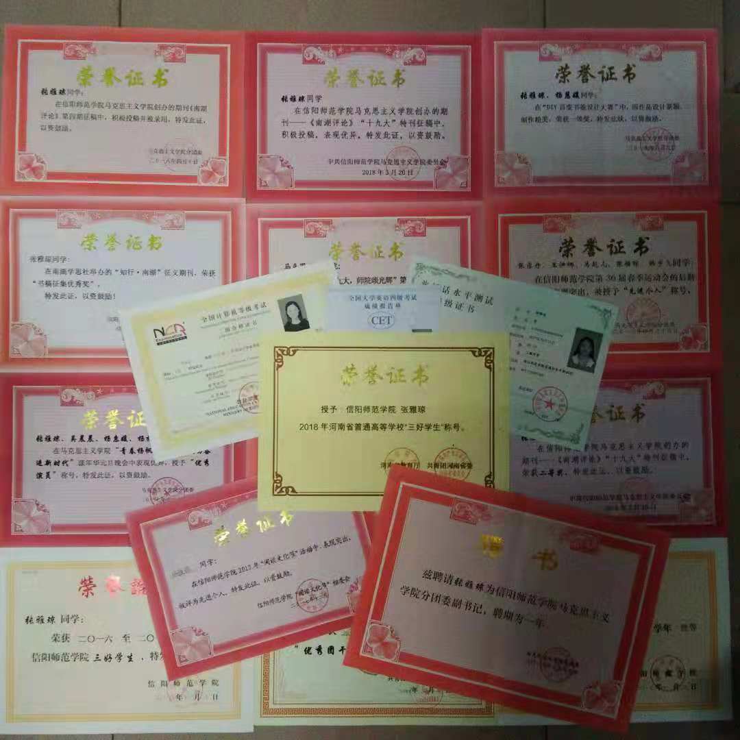 学习之余,积极锻炼写作能力。2018年5月,在《知行•南湖》发表《坚定理想信念,做新时代新青年》一文,并荣获“书稿征集优秀奖”。在院刊《南湖评论》中发表《从< 习近平的七年知青岁月>中汲取奋斗力量》、《让理想信念点燃青春梦想》等文,在2018年3月《南湖评论》“十九大”特刊征稿中,荣获二等奖;2017年12月,在信阳师范公司阅读文化节中被评为“先进个人”。