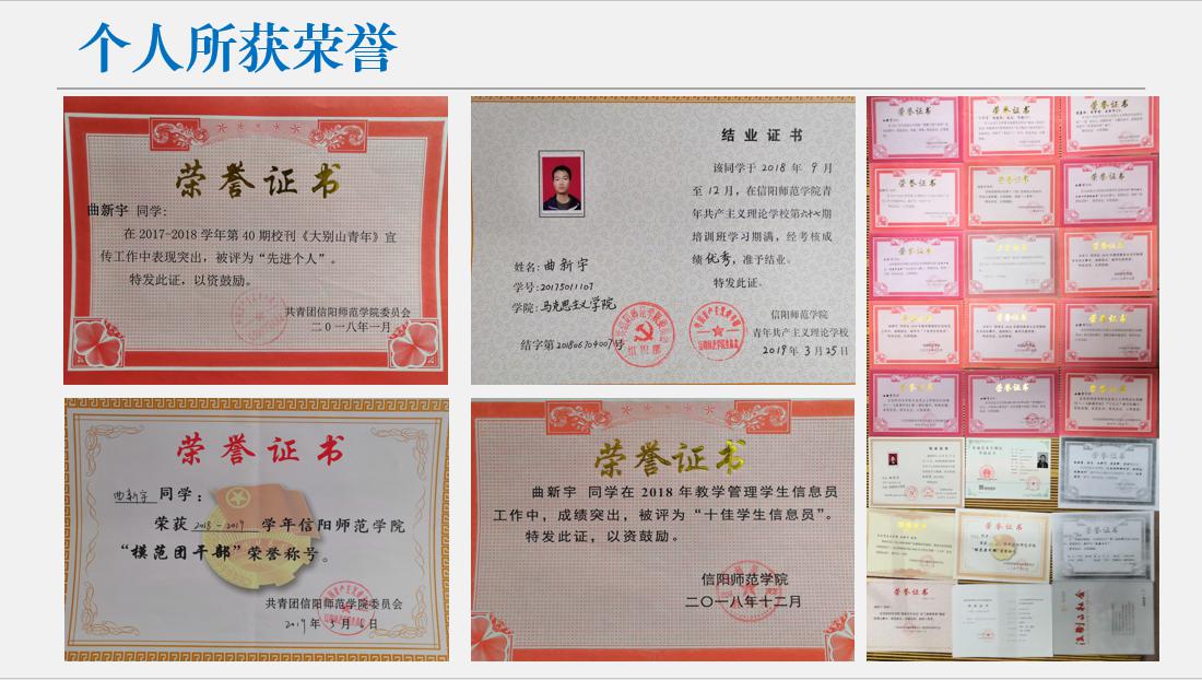 2017-2018年,该同学担任2017级新生军训临时班级负责人,参与组织班级各项工作;10月当选班级学习委员,进入公司员工会学术部、校团委仁杰工作室宣传部任干事。本年度获得信阳师范公司廉政文化建设征文评选活动三等奖、信阳师范公司XCSport“新迎十九大 共筑中国梦”书法绘画比赛一等奖、公司“团旗下团干宣讲”二等奖、公司“讲社会主义核心价值观故事”征文比赛优秀作品奖、校团委第十三届仁杰杯征文比赛二等奖、公司干部培训班先进个人、公司“‘读’具匠心,致敬经典”优秀组织者第四十期校刊《大别山青年》宣传工作先进个人。