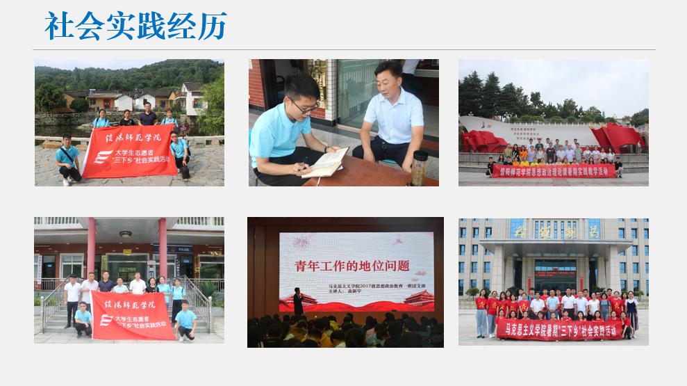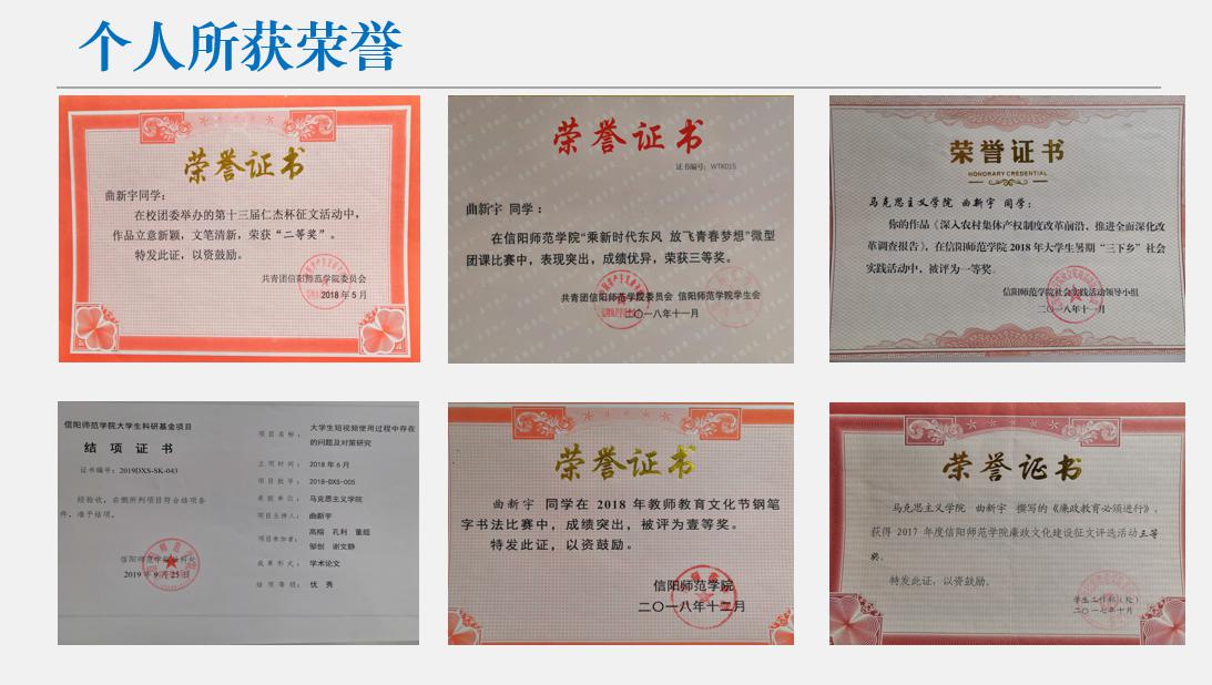 2019-2020年度,该同学坚定理想信念,接续砥砺奋进,顺利完成第六十七期青校培训并以优秀成绩顺利结业。在2019级新生报到工作中积极参与并担任2019级思想政治教育一班班代,协助班主任工作;在第三十二期党员发展对象培训班当中担任院系组长。该同学在本年度获得信阳师范公司模范团干部称号,2019年9月,该同学主持获批的老员工科研积极项目以优秀成绩顺利结项,并在CN刊物发表期刊论文,被中国知网收录。