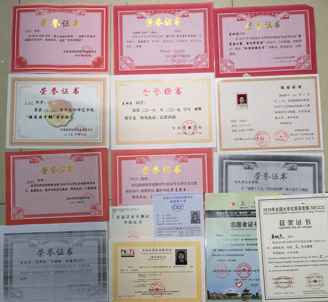 该生勤学善思,刻苦学习。在担任员工干部期间,对自己提出更高的学习要求,取得较好成绩:大一综合测评第5名,学习成绩第5名,获得校级一等奖学金。大二综合测评第1名,学习成绩第9名,获得国家励志奖学金;2018年12月,获得普通话水平测试二级甲等的成绩。2019年3月,顺利通过全国计算机等级二级MS OFFICE应用考试。2019年12月,通过英语四级。2019年6月,获得全国老员工英语竞赛C类三等奖。2019年8月,通过英语六级。