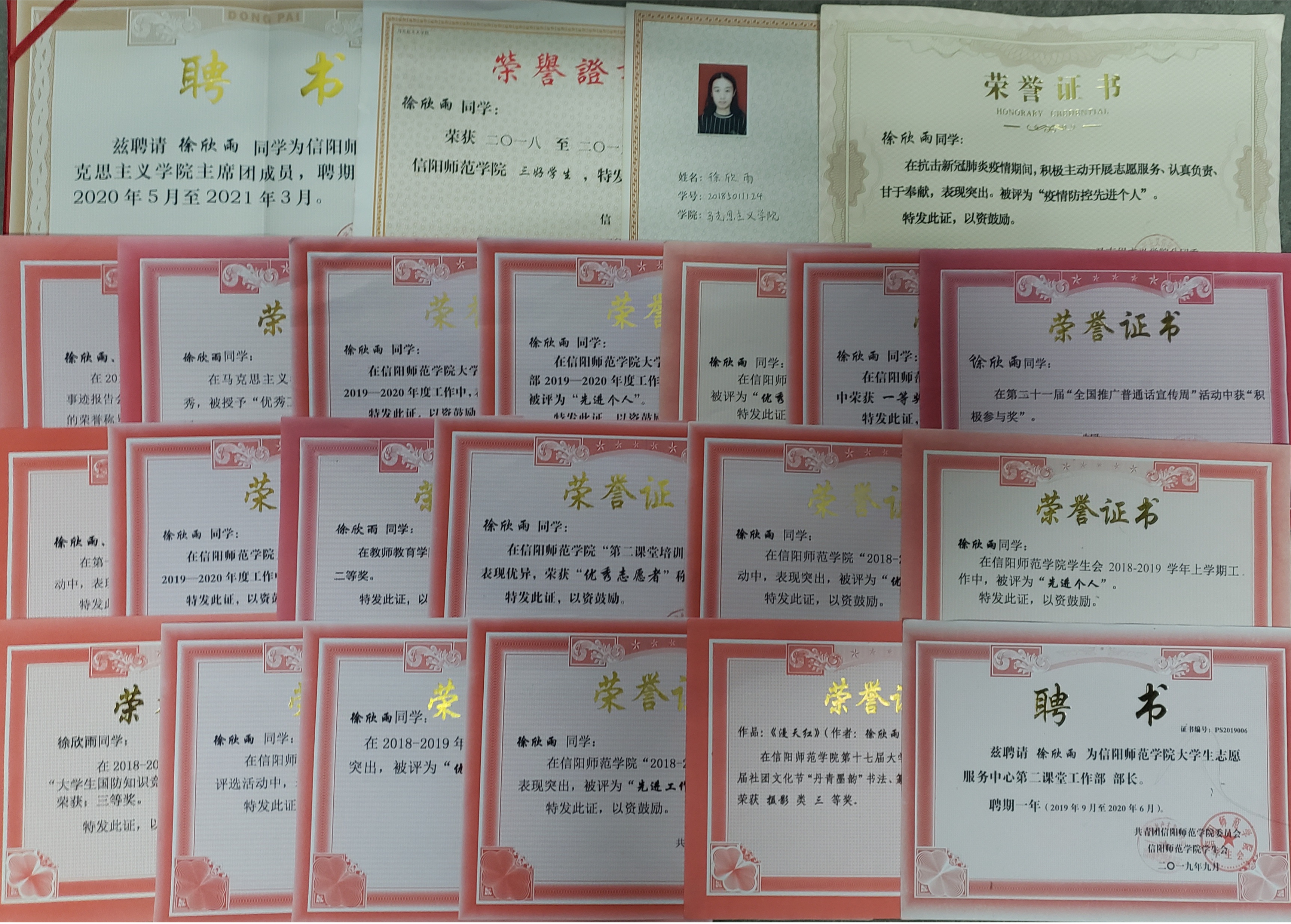 该生积极为公司同学服务,自履职以来始终以不忘初心、不辜负每一张选票为准则,全新全意为公司同学服务,力所能及帮助公司同学解决生活学习困难,同时高质量高标准完成公司任务,协助老师与同学沟通与交流,发挥自身桥梁作用。积极组织、服务公司及公司多项活动,例如信阳师范公司迎新活动、信阳师范公司元旦晚会、信阳师范公司“诗词大会”、信阳师范公司首届社团嘉年华活动、信阳师范公司第八届“十佳教师”活动、信阳师范公司第十届“明星社长”活动等活动。曾获荣誉如“三好员工”、“模范干部”、“优秀工作者”、“优秀志愿者”等。