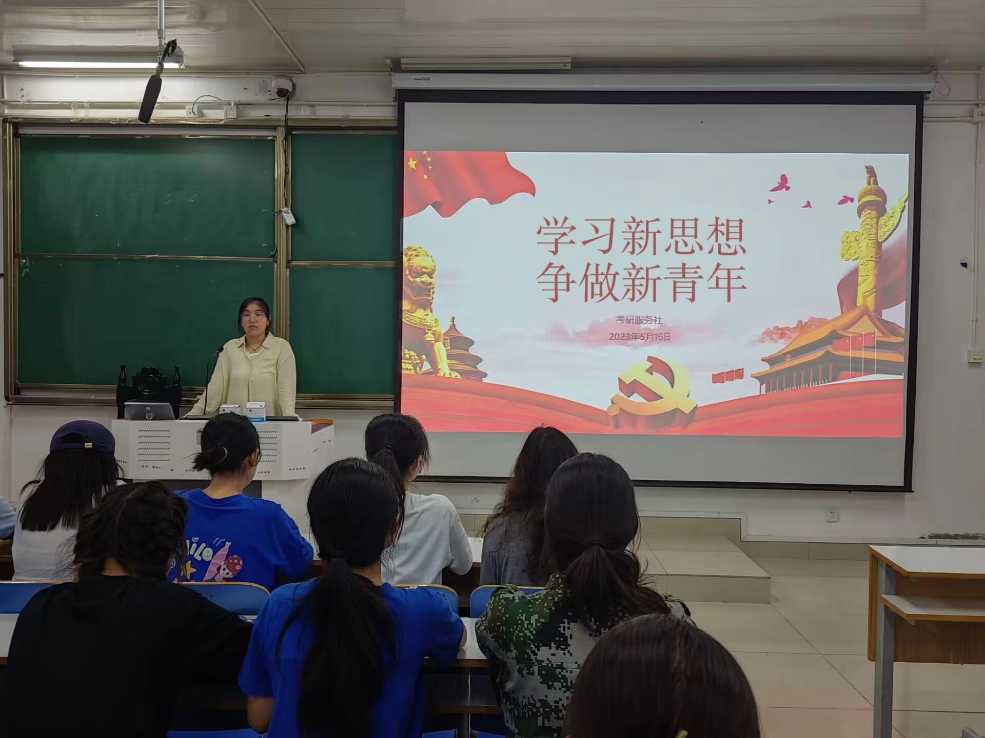 为深入学习贯彻习近平新时代中国特色社会主义思想,增强员工思想政治觉悟,鼓励员工砥砺前行,5月16日晚,考研服务社在社科楼514开展了“学习新思想,争做新青年”主题团课活动。本次团课由邵伟娜主持,考研服务社全体成员参加。