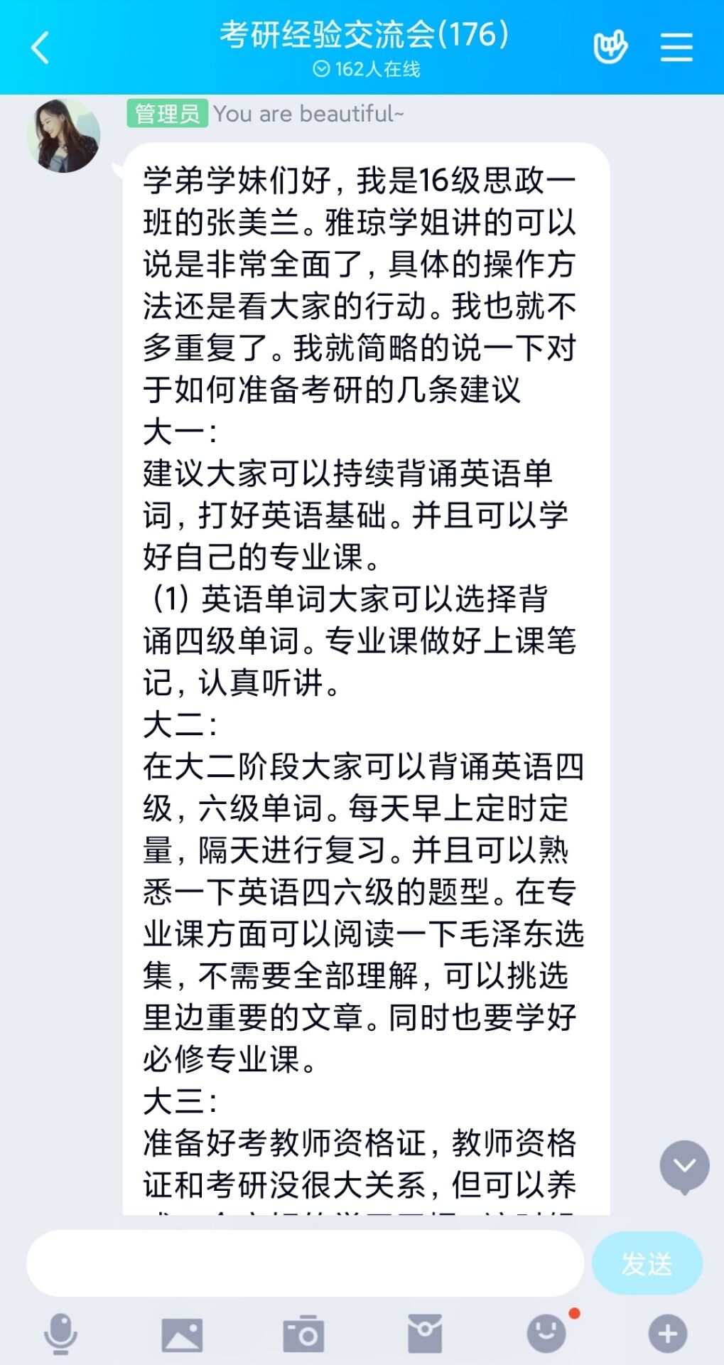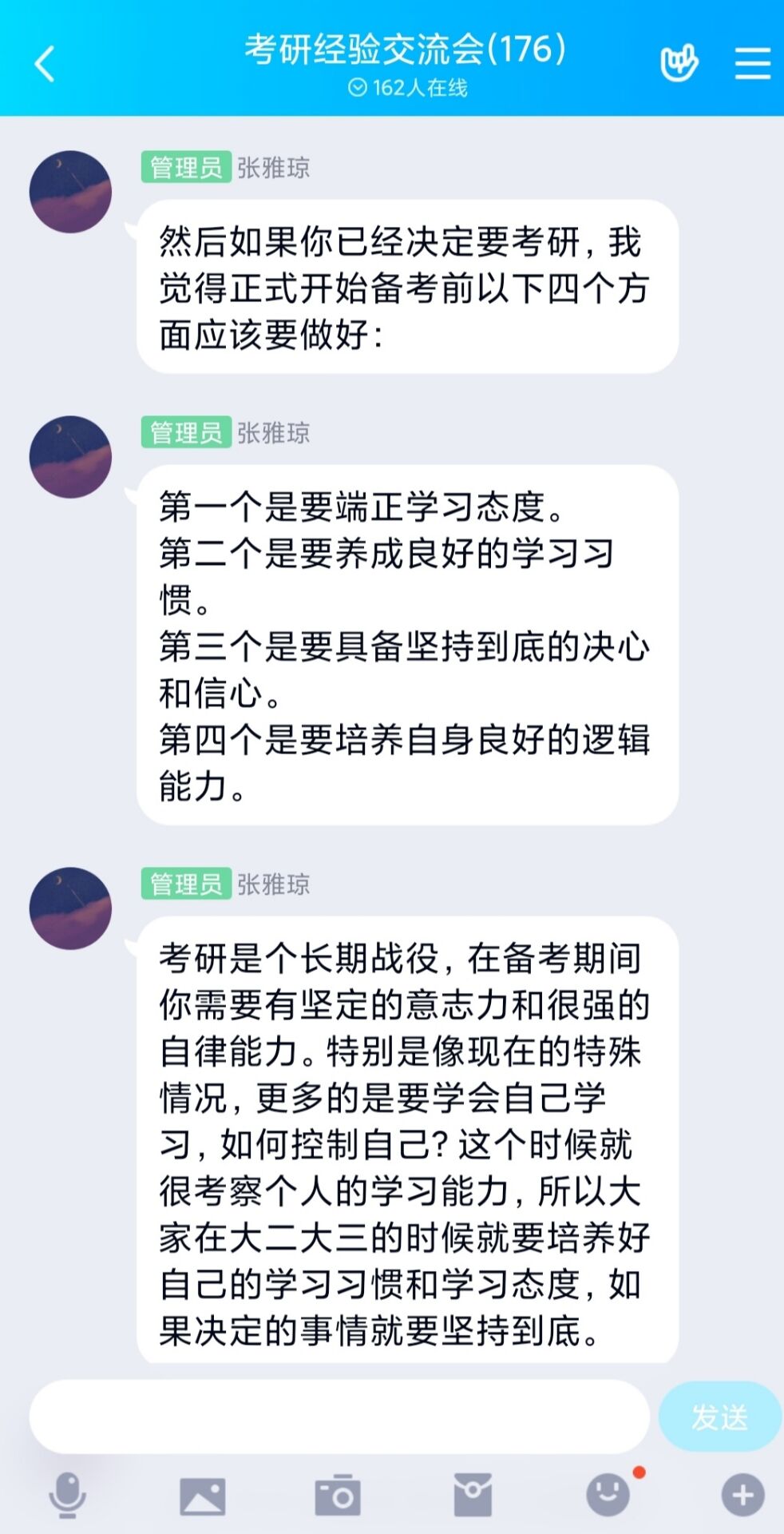 6月11日下午,XCSport考研服务社通过腾讯QQ线上平台举办了“以梦为笔,绘美研途”主题考研经验交流会。公司2016级优秀考研员工代表张雅琼、张美兰以及2018、2019级有意向考研的同学共同参加本次交流会。会议由考研服务社牛笑怡主持。