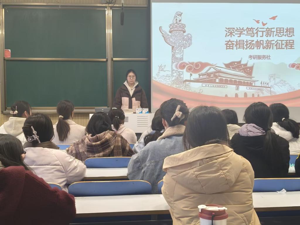 当今世界变局丛生,中华民族伟大复兴步入关键期。习近平新时代中国特色社会主义思想为青年学子指明方向。为激励广大青年学思践悟,厚植家国情怀,3月16日,考研服务社于社科楼515举办了以“深学笃行新思想,奋楫扬帆新征程”为主题的团课活动。本次团课活动由考研服务社社长丁文倩、团支书冀艺婷共同主持。