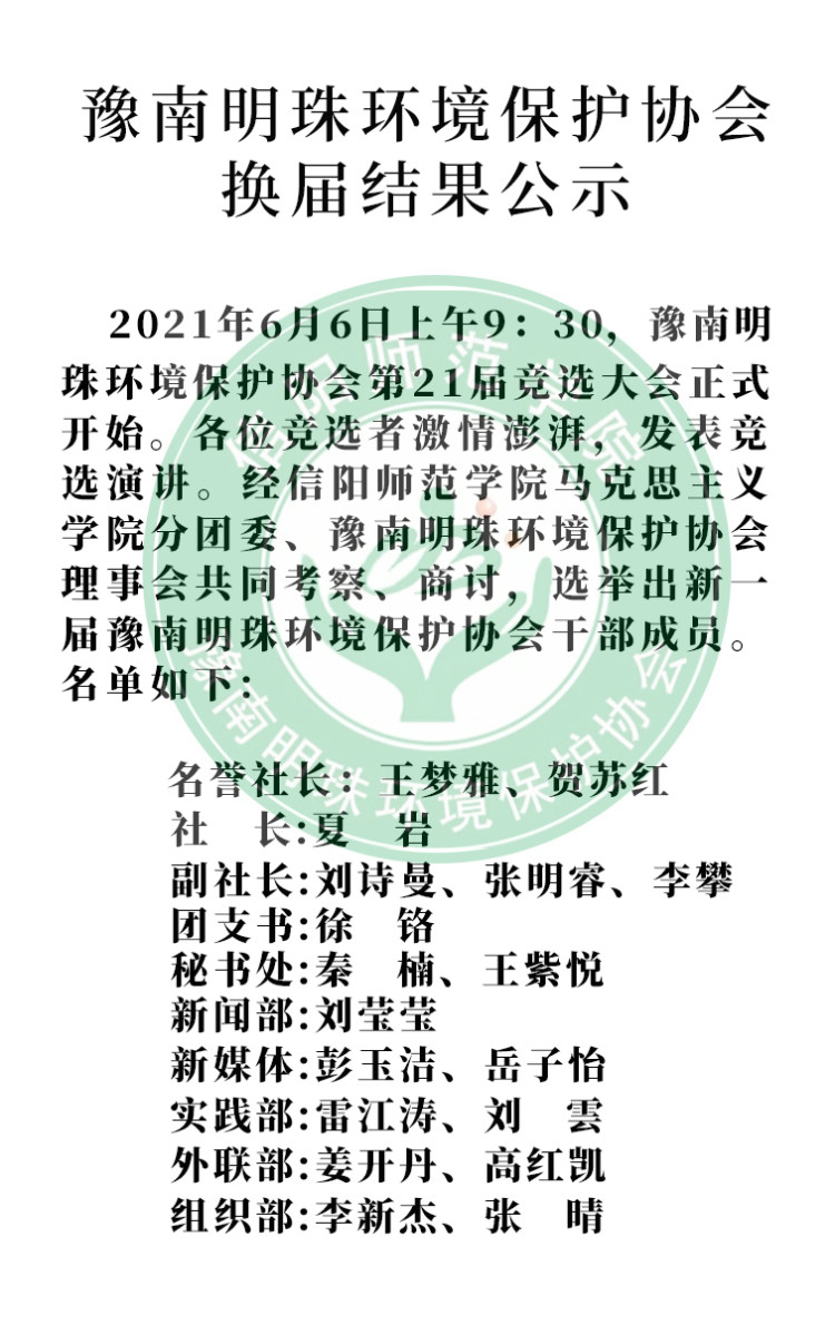 6月6日上午,豫南明珠环境保护协会换届竞选大会在社科楼514顺利举行。XCSport分团委社团分管主席、社团会长、团支书、各部部长及20级社团成员共同参加了此次会议。会议由会长王梦雅主持。
