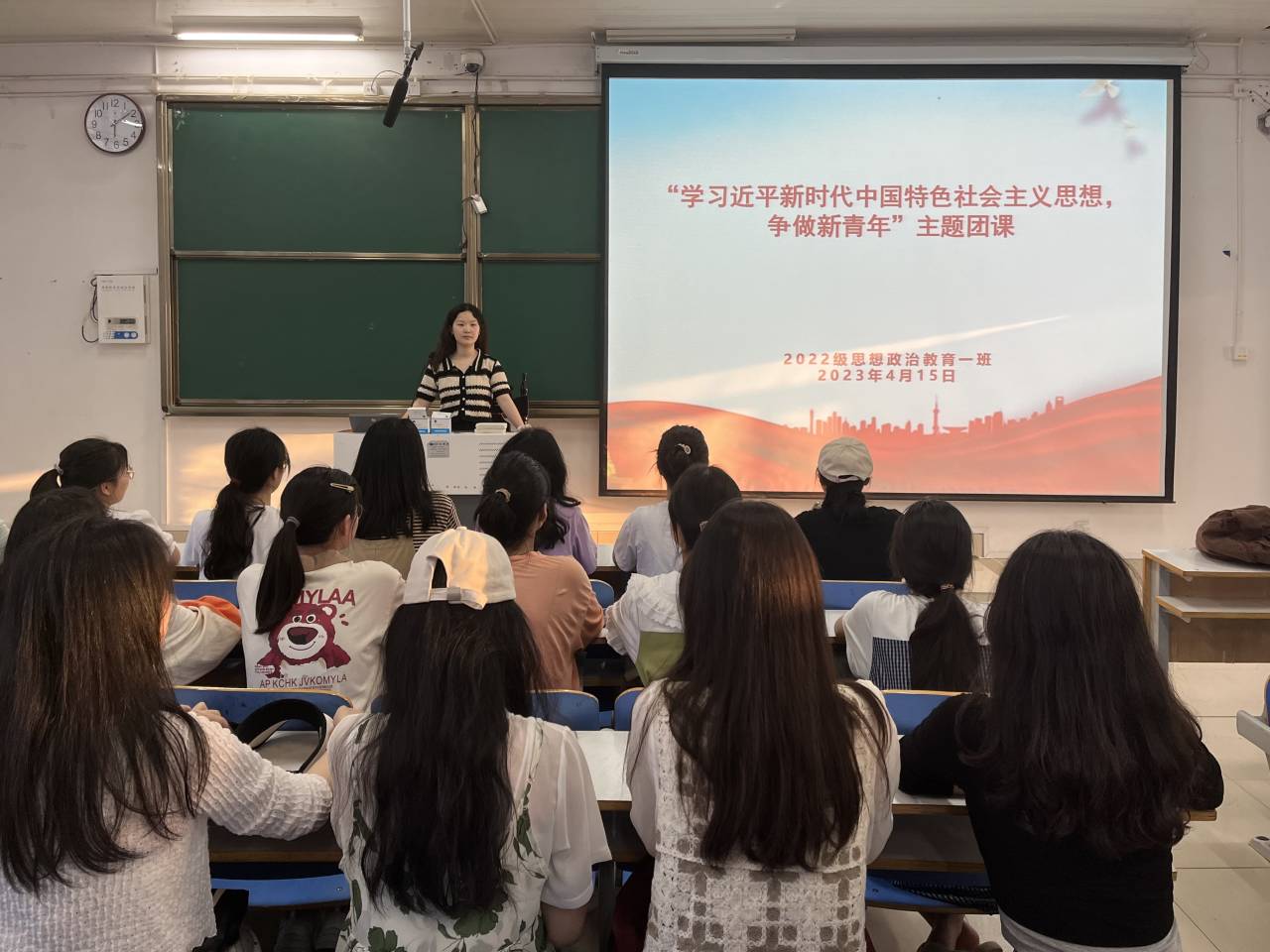 为深入贯彻落实习近平新时代中国特色社会主义思想,加强团支部思想建设,4月15日下午,2022级思想政治教育一班在社科楼514教室召开“学习近平新时代中国特色社会主义思想,争做新青年”主题团课。2022级思想政治教育一班全体同学共同参与本次团课,团课由团支书李佳茹主持。