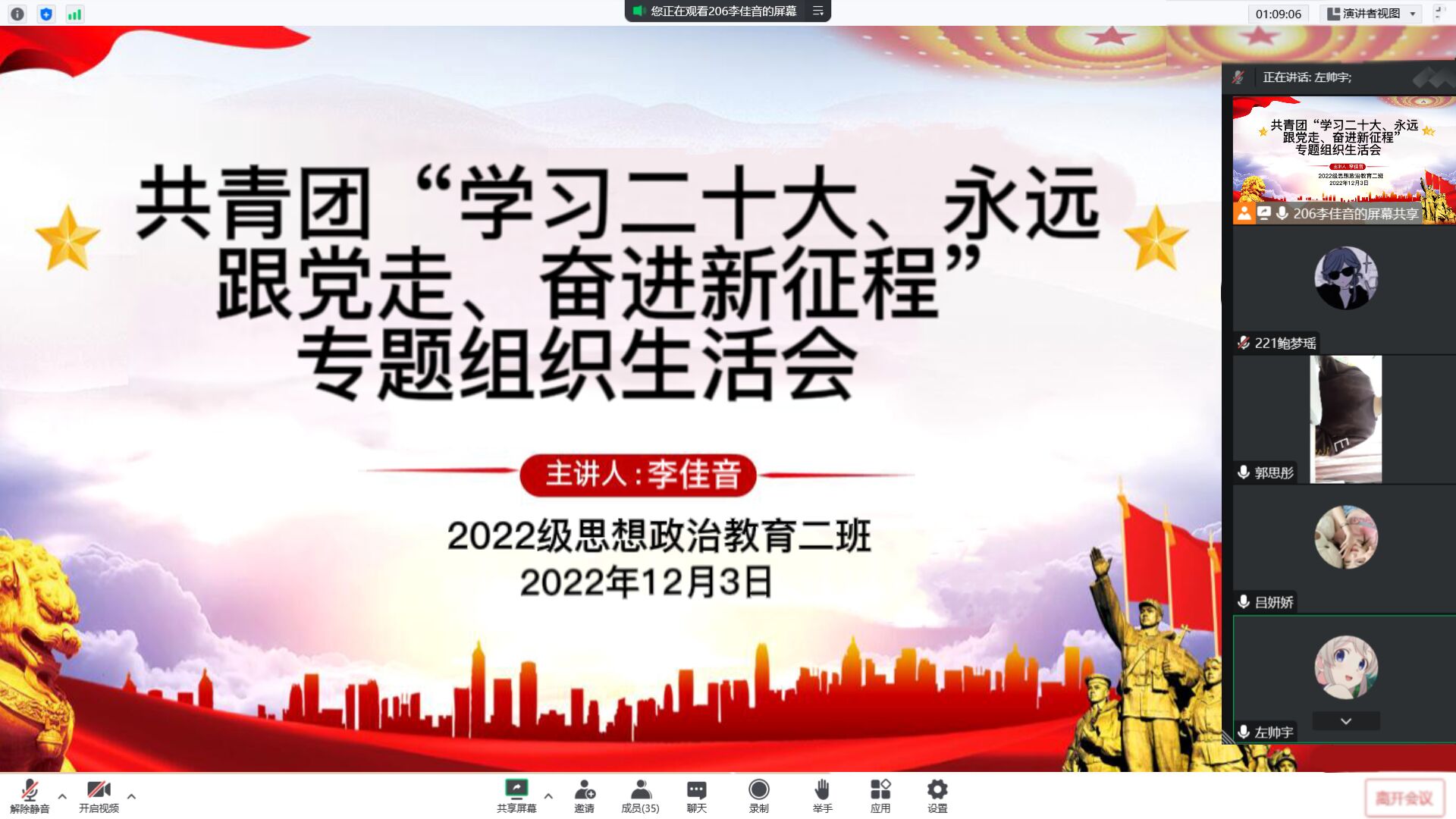 为深入学习贯彻党的二十大精神,加强基层团组织建设,12月3日晚上,2022级思想政治教育二班于线上召开共青团“学习二十大、永远跟党走、奋进新征程”专题组织生活会。2022级思想政治教育二班全体共青团员共同参加会议。本次会议由团支书李佳音主持。
