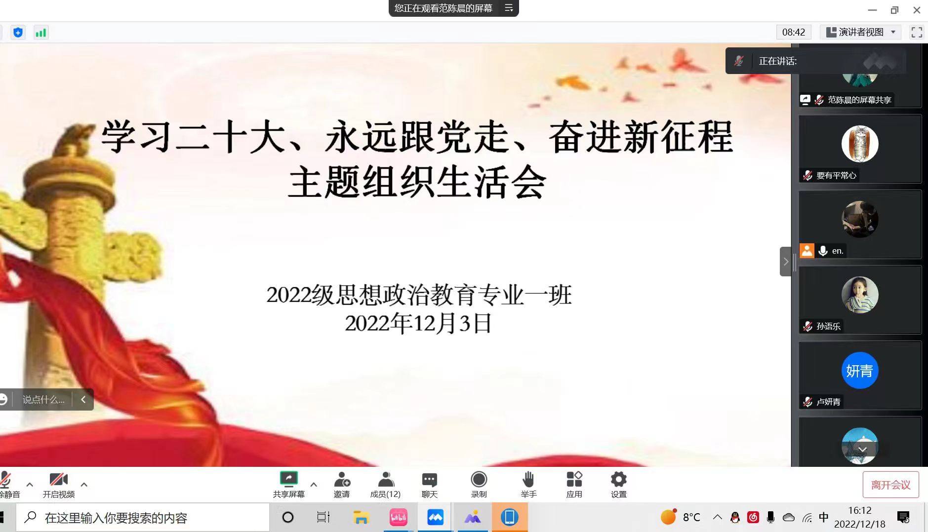 为深入学习贯彻党的二十大精神,加强团支部思想建设,12月3日下午,2022级思想政治教育一班在线上召开“学习二十大,永远跟党走,奋进新征程”主题组织生活会。2022级思想政治教育一班班主任王明园和团支部全体成员参与本次会议,会议由团支部书记李佳茹主持。