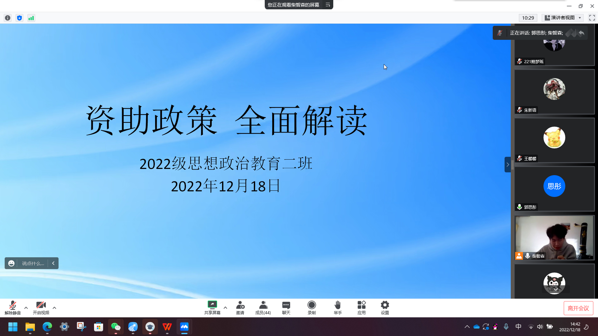 为使员工进一步了解和明确国家教育资助政策,提升资助育人质量,12月18日下午,2022级思想政治教育二班于线上召开“资助政策 全面解读”主题班会。2022级思想政治教育二班全体同学共同参加会议。班会由副班长柴智森主持。