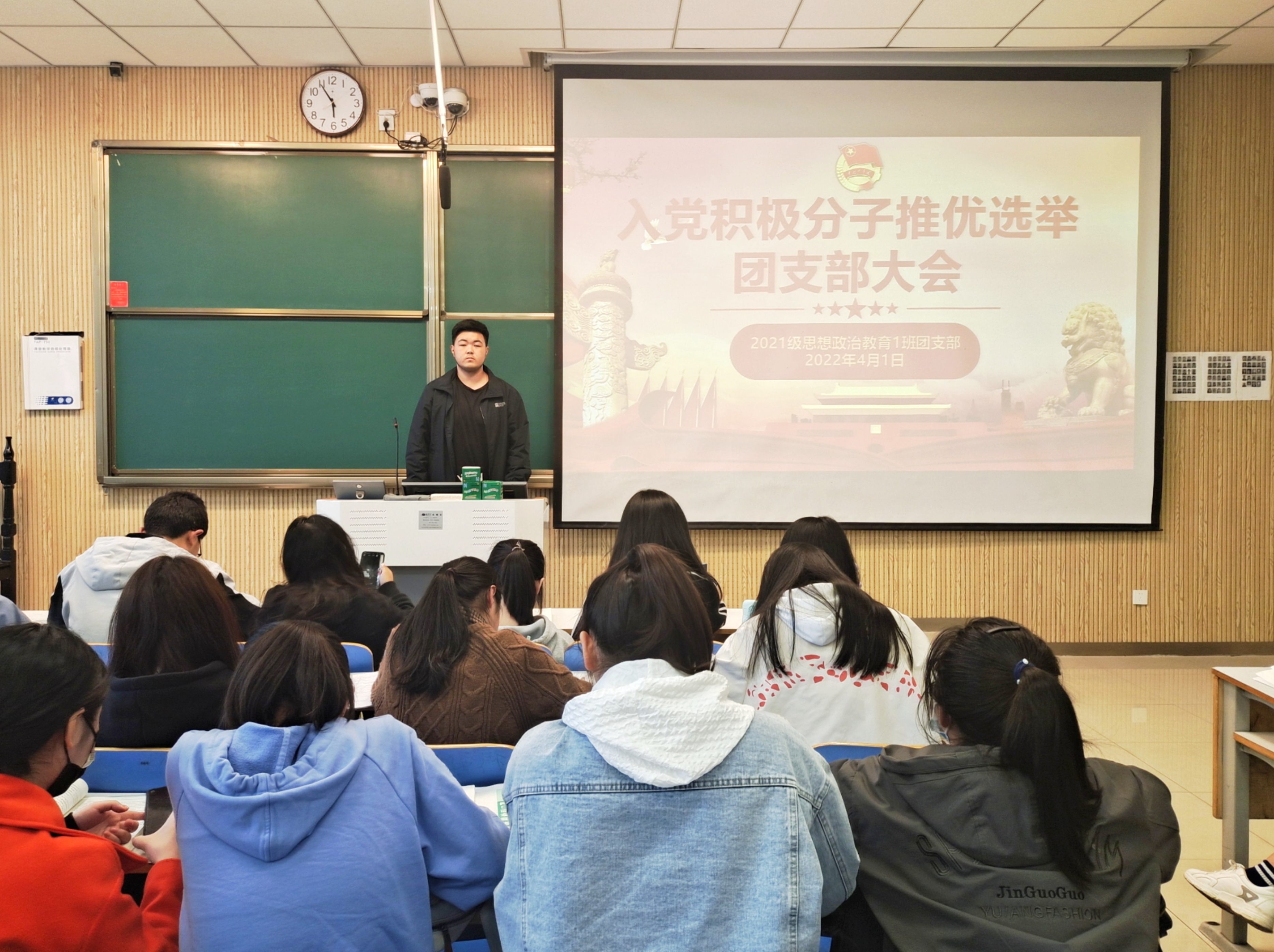 4月1日下午,2021级思想政治教育一班在社科楼515召开入党积极分子推优选举团支部大会。2021级思想政治教育一班全体团员共同参加了本次团支部大会。团支部大会由团支书戴翰林主持。