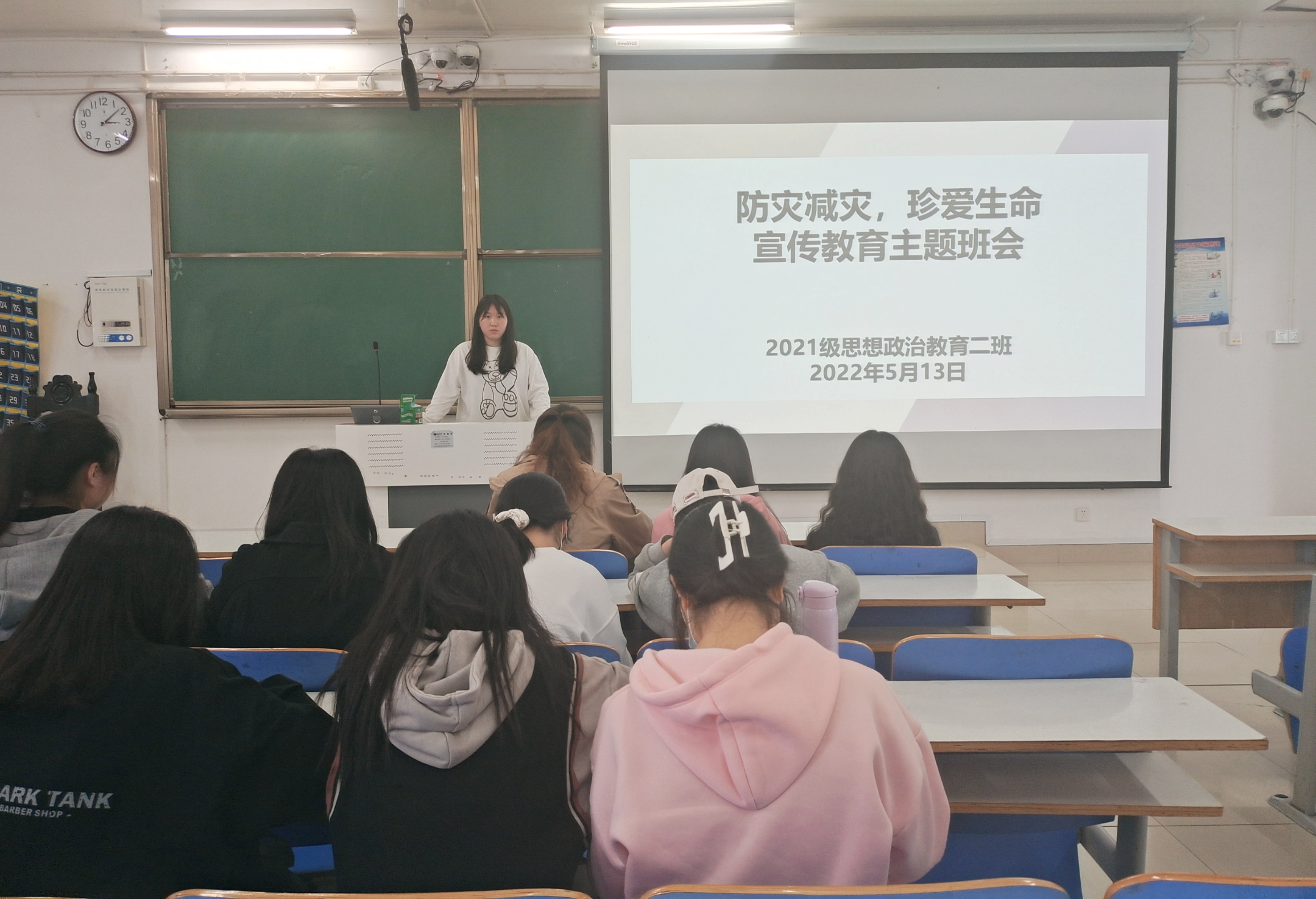5月13日,2021级思想政治教育二班在社科楼514教室召开“防震减灾,珍爱生命”宣传教育主题班会。2021级思想政治教育二班全体成员参加此次主题班会。班会由团支书王婧欣主持。
