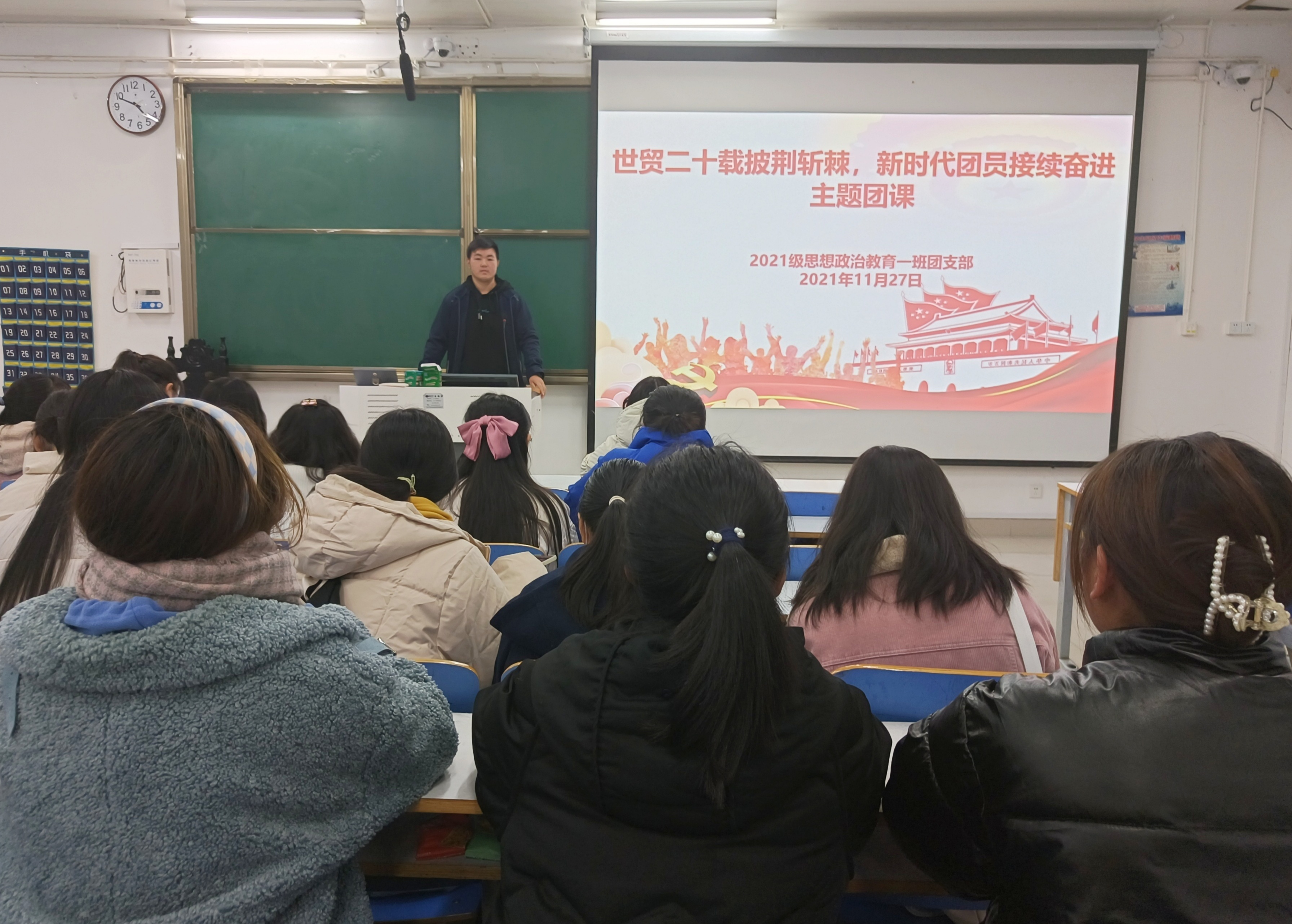 11月27日上午,马克主义公司2021级思想政治教育一班在社科楼514教室召开“世贸二十载披荆斩棘,新时代团员接续奋进”主题团课。2021级思想政治教育一班全体团员共同参与本次团课。团课由团支书戴翰林主持。