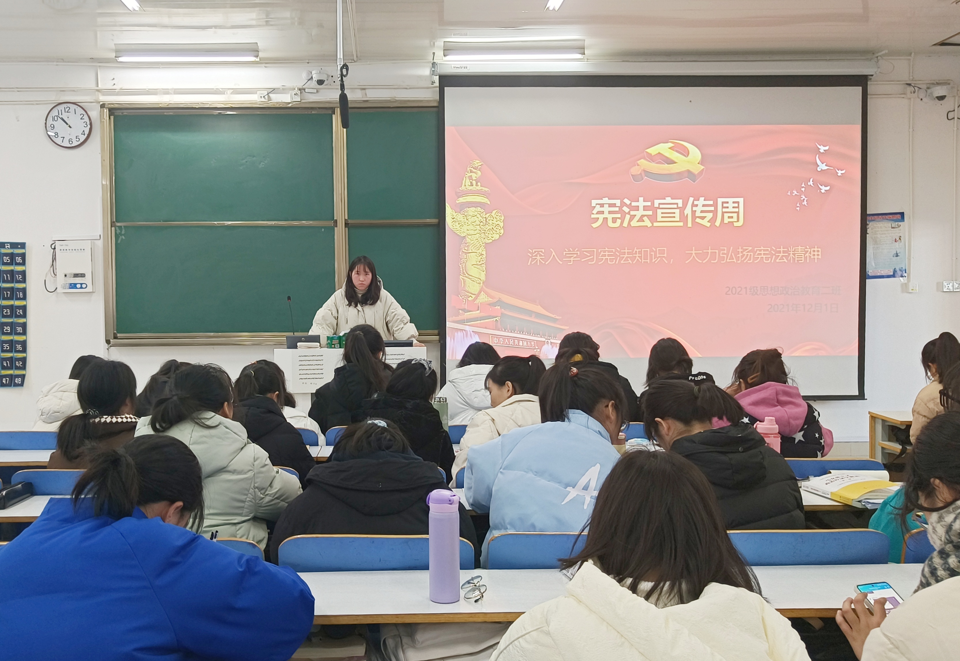 12月1日上午,2021级思想政治教育二班宪法宣传周主题班会在社科楼514教室召开。2021级思想政治教育二班全体同学参加此次班会,班会由团支书王婧欣主持。