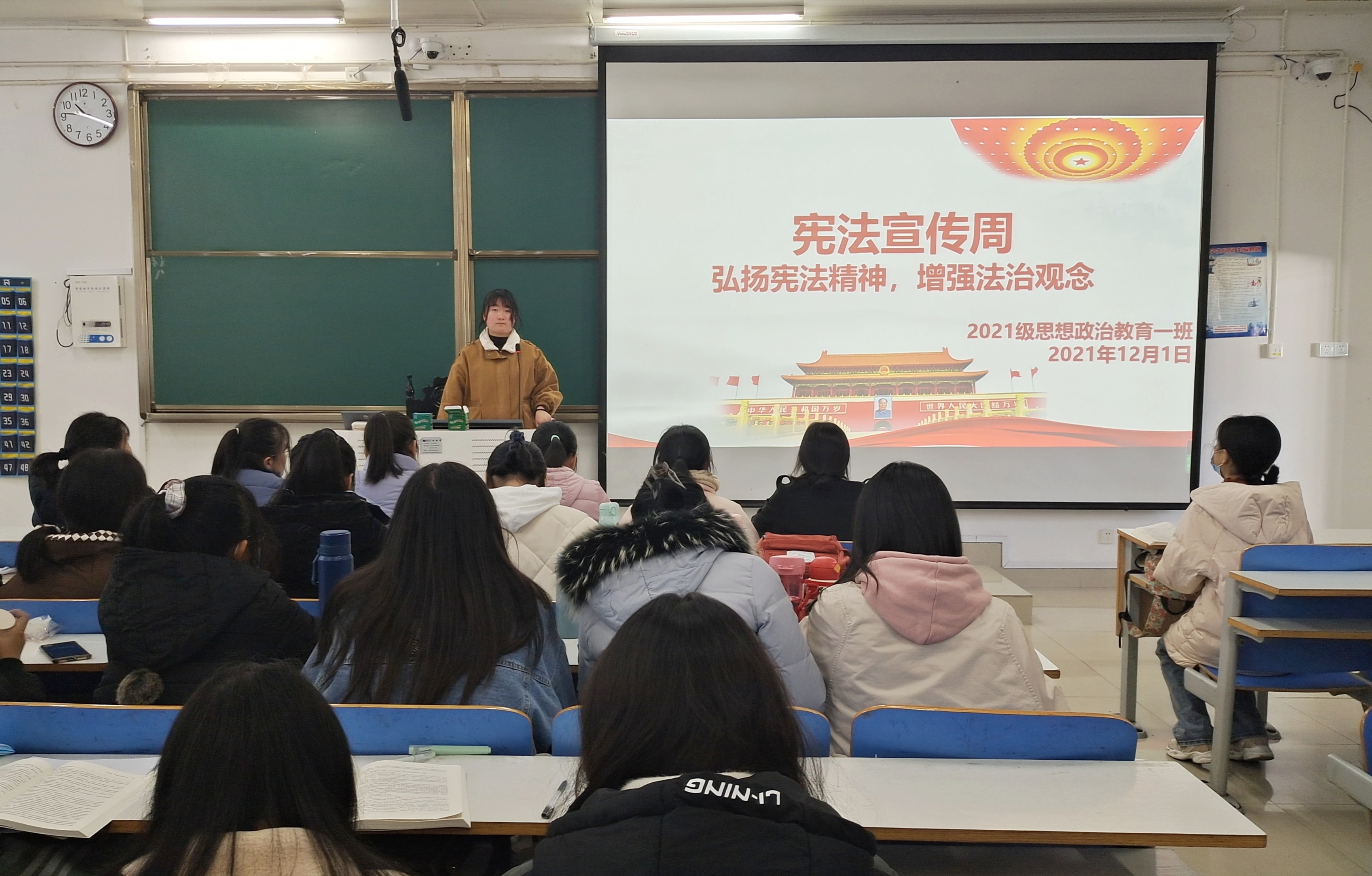 为增强同学们的法治观念,学习贯彻宪法精神,12月1日上午,2021级思想政治教育一班在社科楼514教室召开“弘扬宪法精神,增强法治观念”主题班会。2021级思想政治教育一班全体成员参加本次班会。班会由副班长雷敏主持。