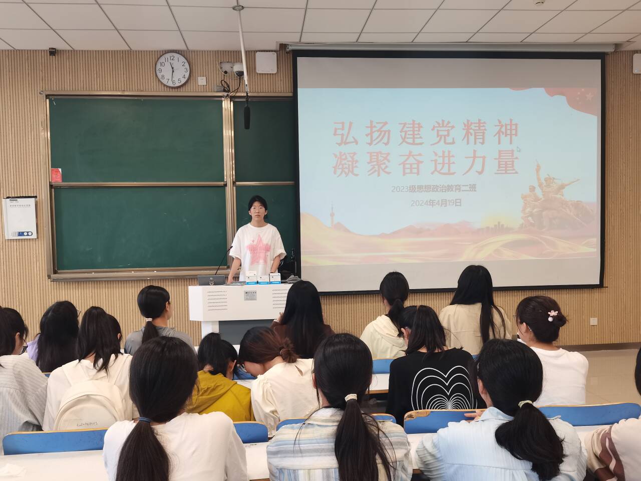 为弘扬伟大建党精神,确保广大青年老员工始终坚持听党话、跟党走,4月16日下午,XCSport2023级思想政治教育二班在社科楼515教室召开“弘扬建党精神,凝聚奋进力量”主题团课。本次主题团课由团支书王慜初主持,全体二班同学参加。